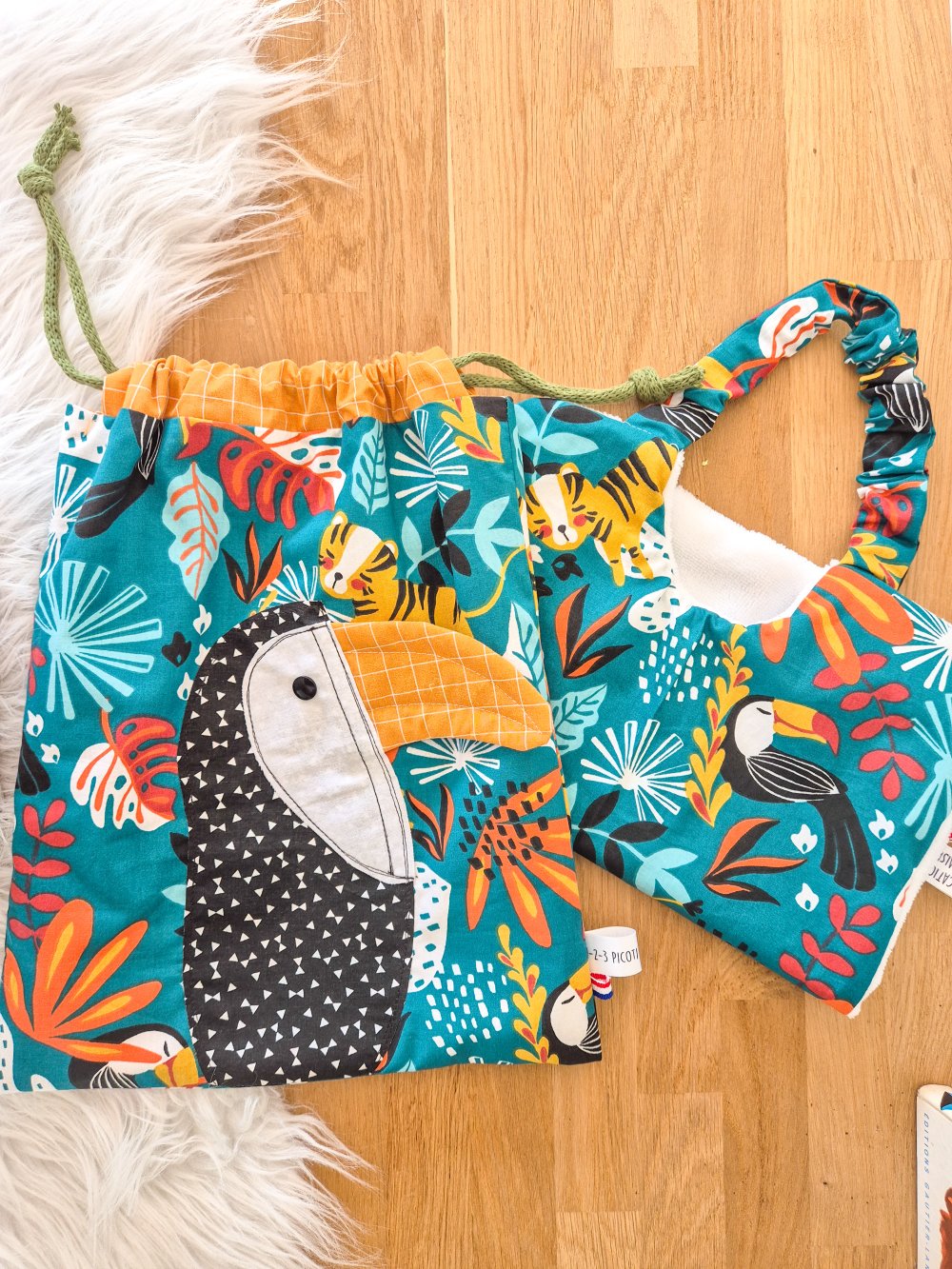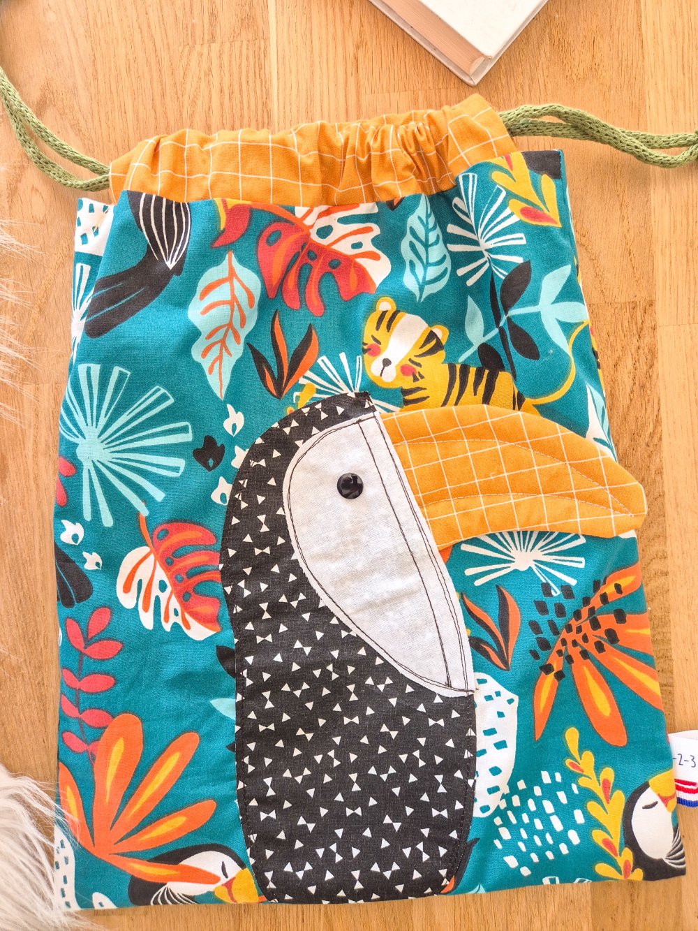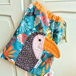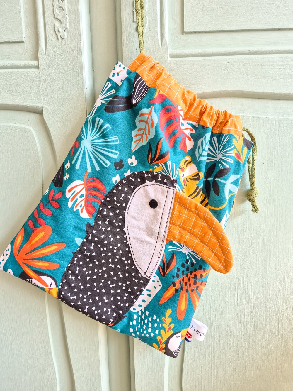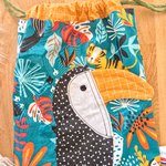 Pochon doublé en coton fantaisie avec un motif toucan .Tout est coupé à la main , surpique pour plus de fantaisie et de maintien .