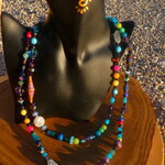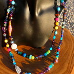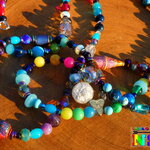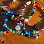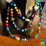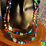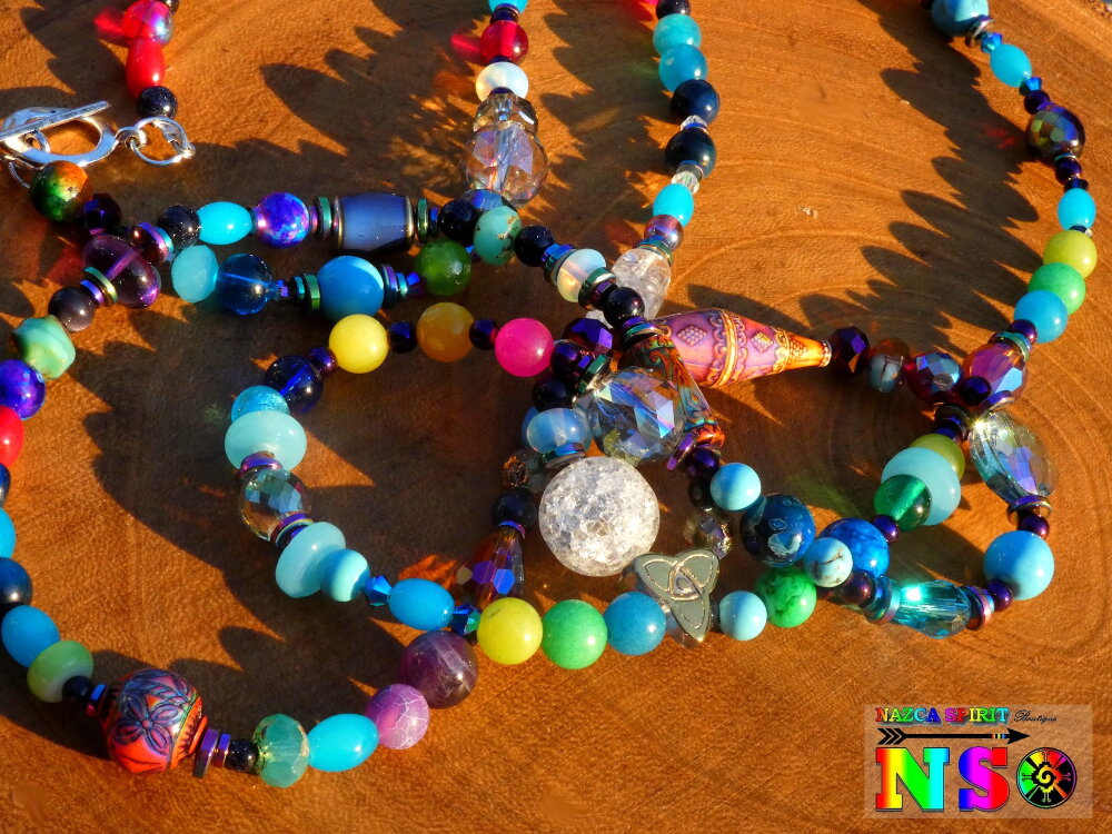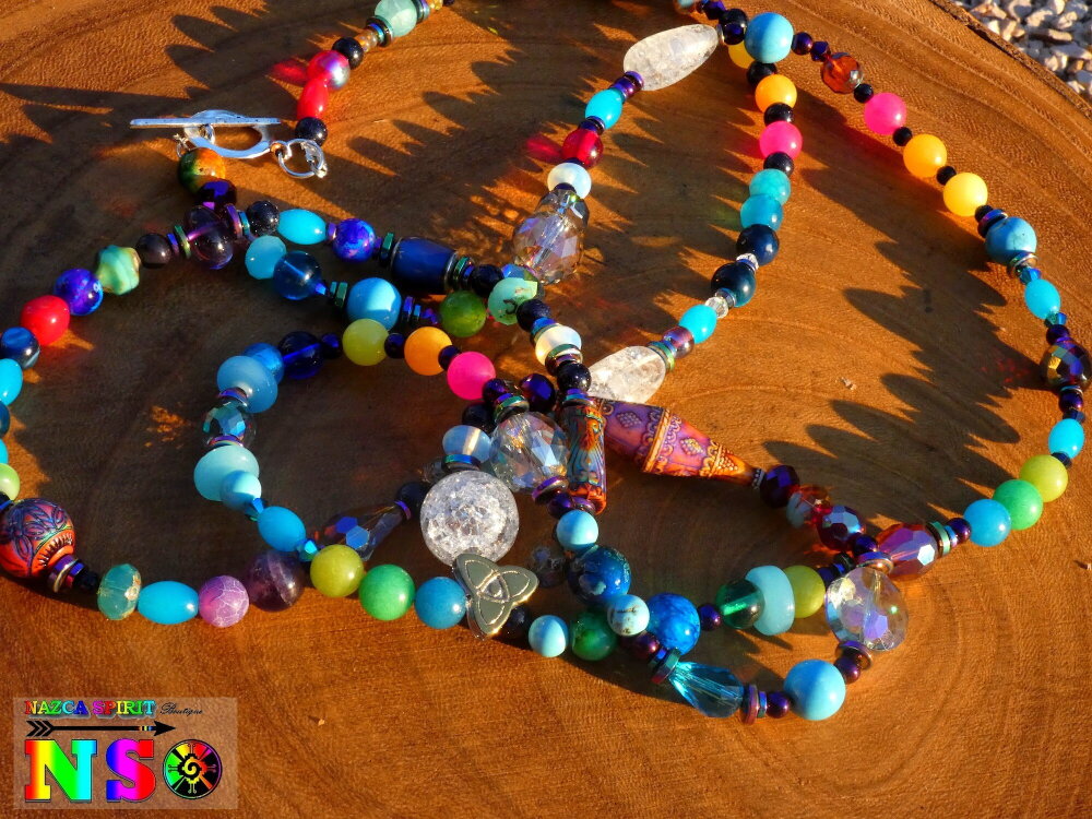 Pour la composition de ce collier j'ai utilisé un grand nombre de variété de perles dont voici une liste non exhaustive : cristal de bohème et perles en verre (origine : Tchécoslovaquie), perles bicônes cristal Swarovski (origine : Autriche), cristal de roche (origine : France), agates teintées (origine : Inde), turquoises naturelles stabilisées (origine : U.S.A), perles en pierre du soleil bleu marine, opalines (origine : Asie), opales (Origine : Ethiopie), perles en pâte polymère et en verre thermo changeantes (origine : U.S.A - Miami), hématites arc-en-ciel (origine : Chine), corail (Origine : Philippines)...