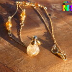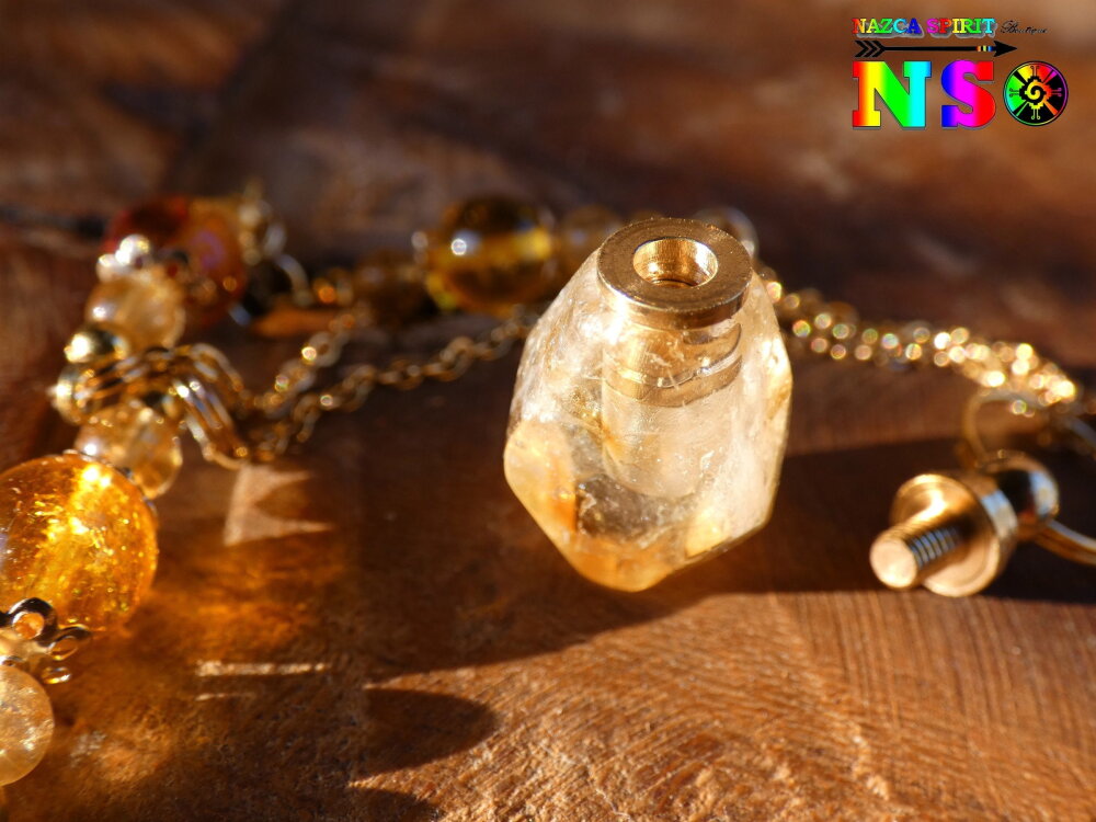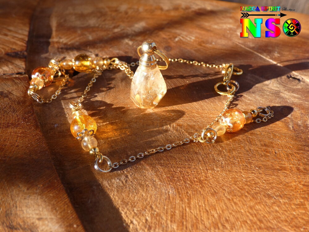 Matériaux : flacon et perles en cristal de citrine naturelle (Origine : Inde), laiton doré, acier inoxydable plaqué or 18K