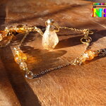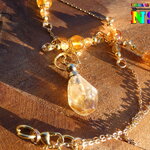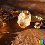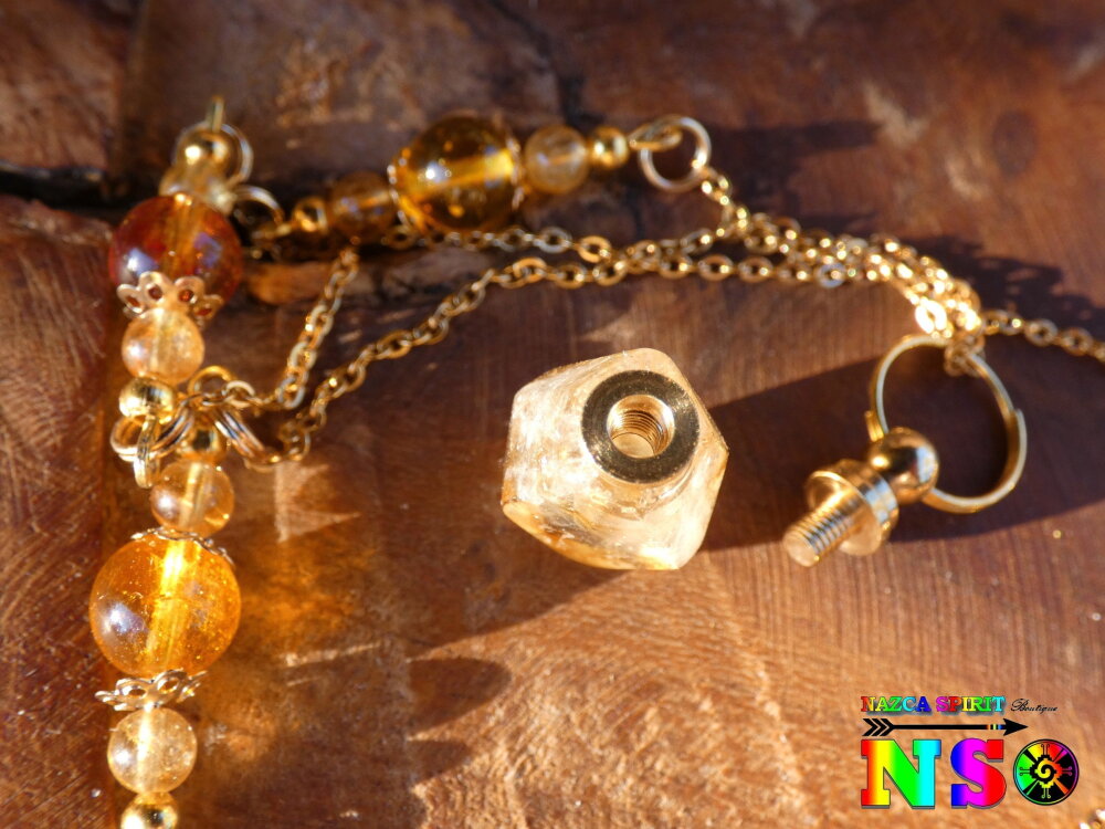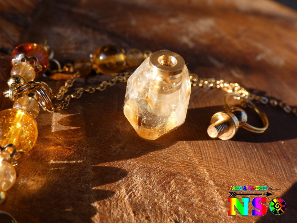 J'ai ensuite suspendu à ce tour de cou réalisé intégralement à la main, un magnifique pendentif flacon de parfum en cristal de citrine naturelle de 3.5 cm de haut x 1.5 cm de large, pierre brute à facettes. Le pendentif flacon a une capacité de remplissage de 2 ml. Grâce à un compte-gouttes fourni, vous pourrez remplir votre pendentif avec votre parfum préféré.