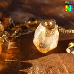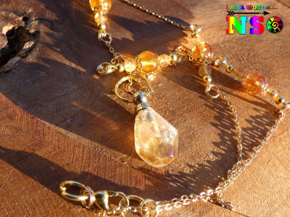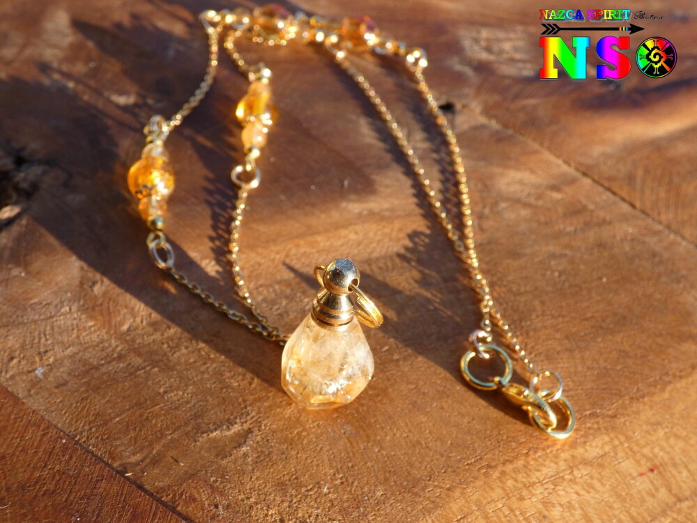 Sautoir Pendentif de 3.5 cm Flacon de Parfum 2 ml en Cristal de Citrine Naturelle, Bijou Pierres Fines Chaîne Acier inoxydable plaqué Or 18K et Perles de Citrine. Sautoir fourni avec Compte Gouttes Plastique pour remplir le flacon.
