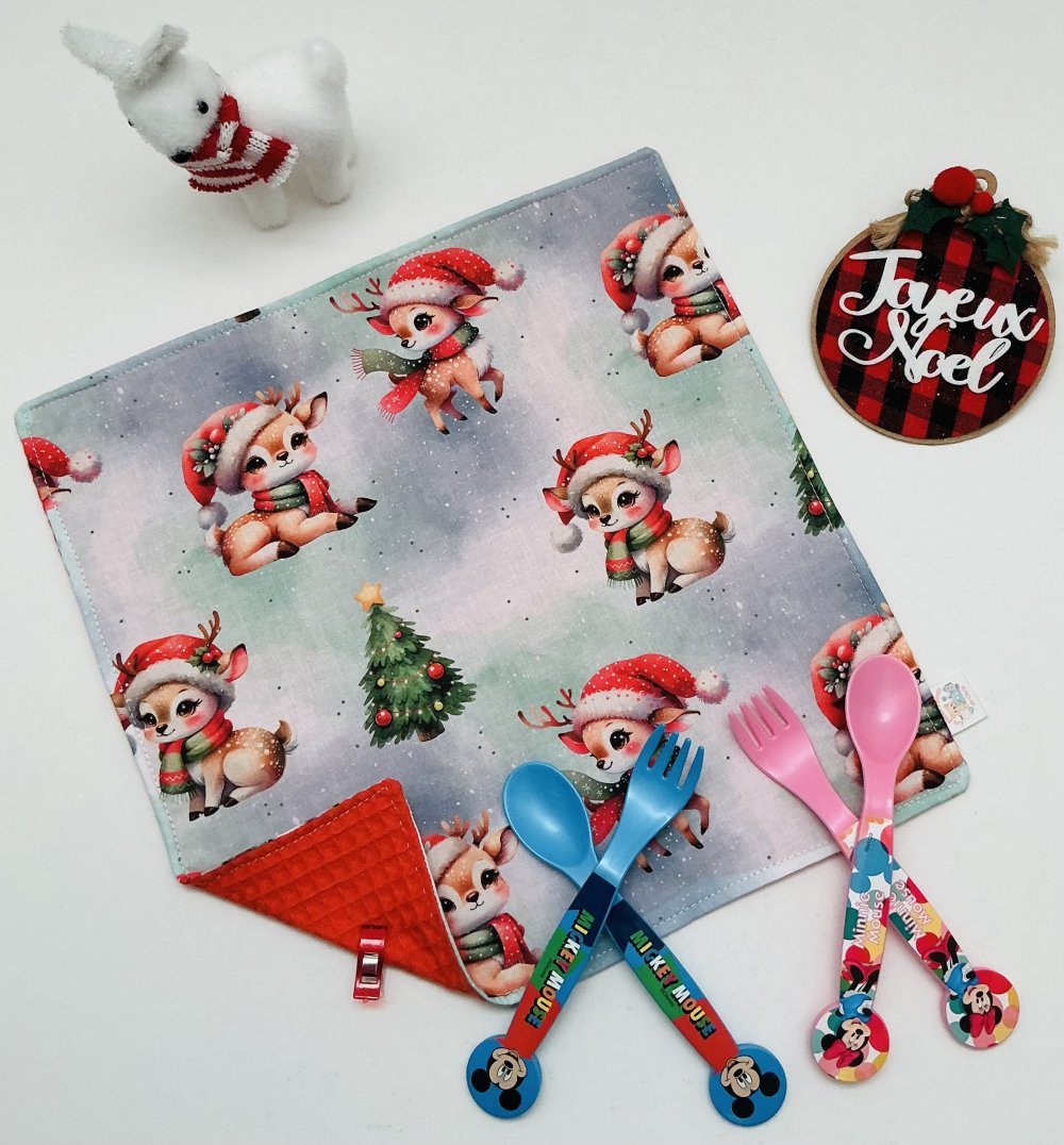 Serviette enfant Noël – 30x30 cm En coton certifié Oeko-Tex, dos en nid d’abeille absorbant. Motifs festifs, douce et lavable. Parfaite pour les repas joyeux des petits