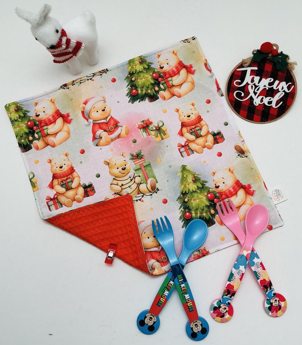 Serviette enfant Noël – 30x30 cm En coton certifié Oeko-Tex, dos en nid d’abeille absorbant. Motifs festifs, douce et lavable. Parfaite pour les repas joyeux des petits