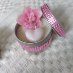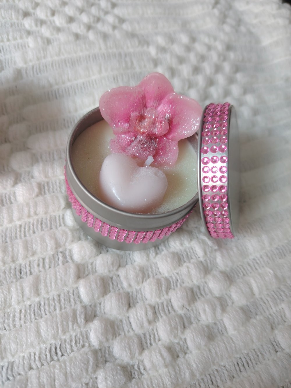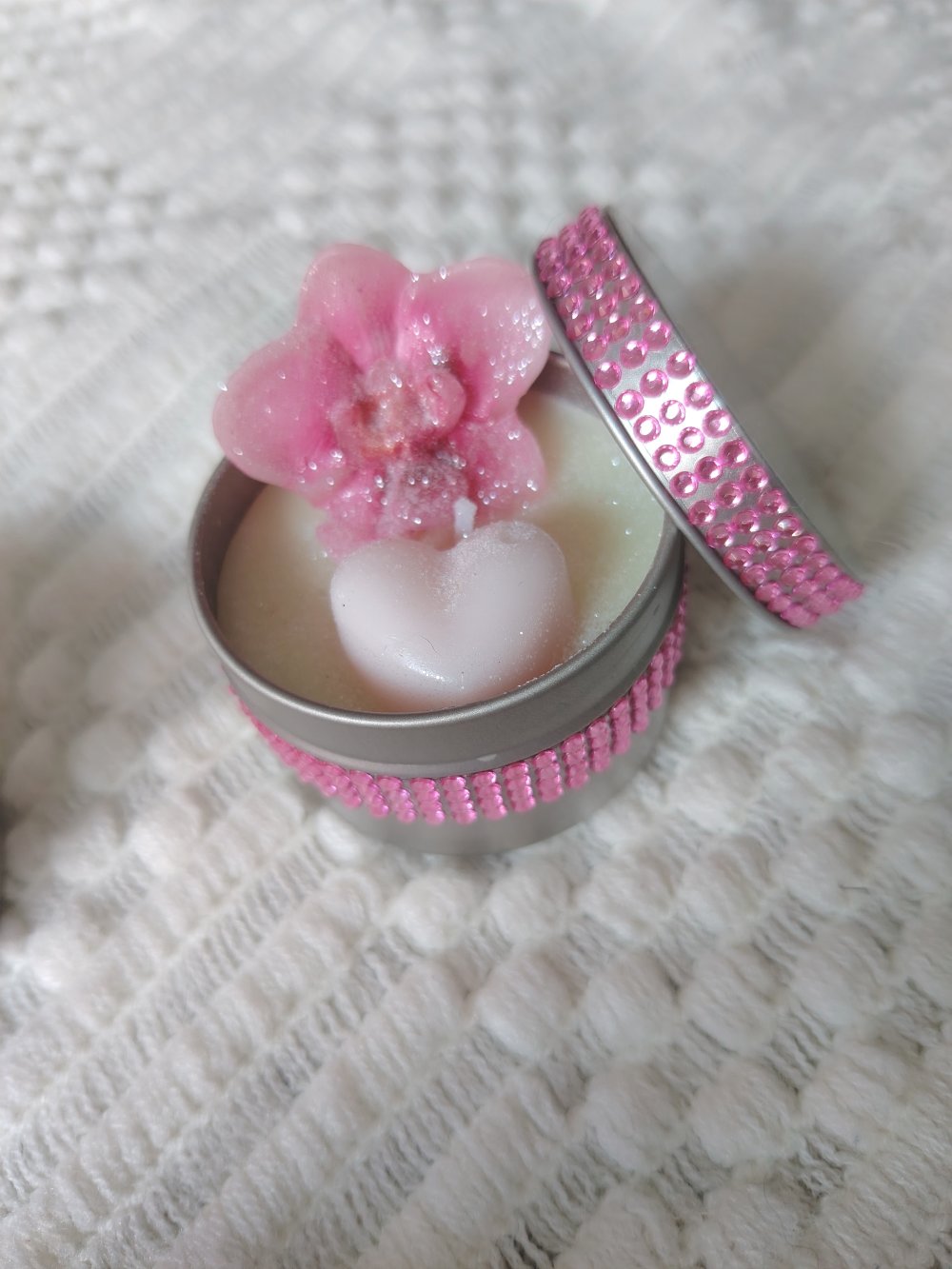 Jolie bougie parfumée décorative dans une boîte en aluminium aux fruits rouges orné d'une fleur orchidée fushia , d'un petit coeur fondant rose et une finition paillettes et d'un ruban strass rose .