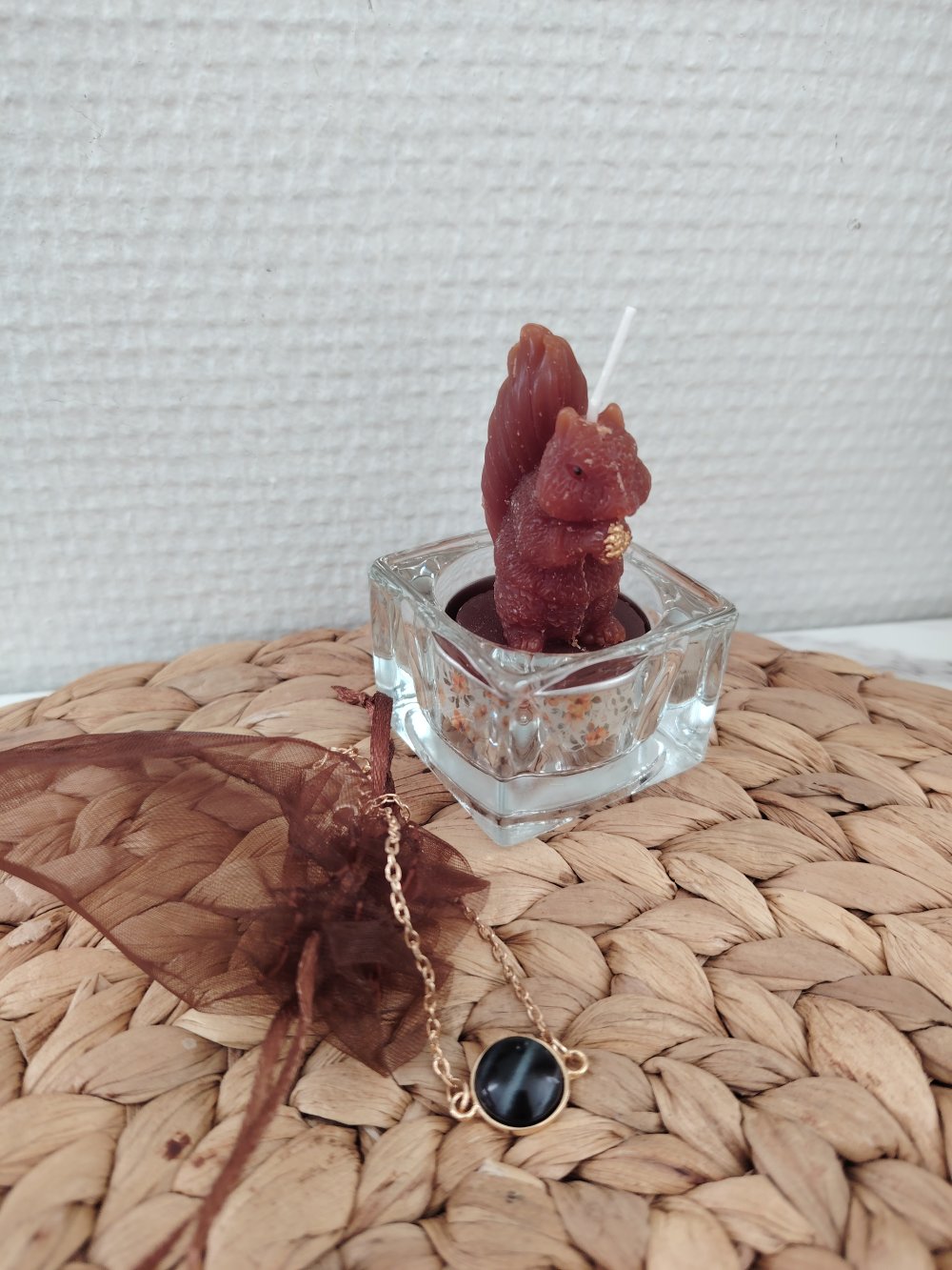 -Un porte bougie en verre avec sa bougie chauffe-plat écureuil naturelle,habillé d'un ruban automnale.