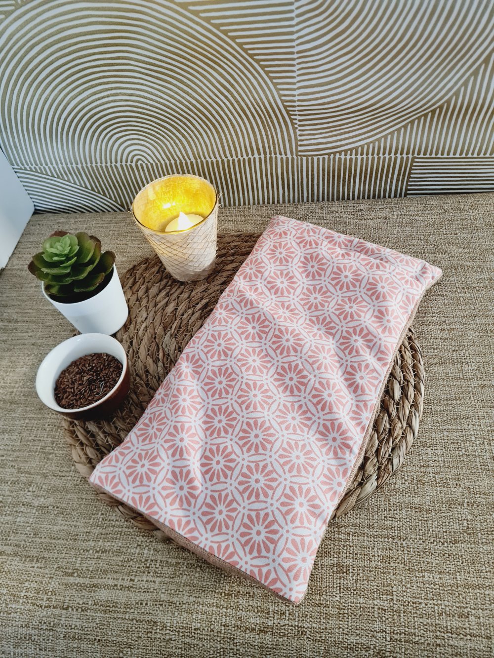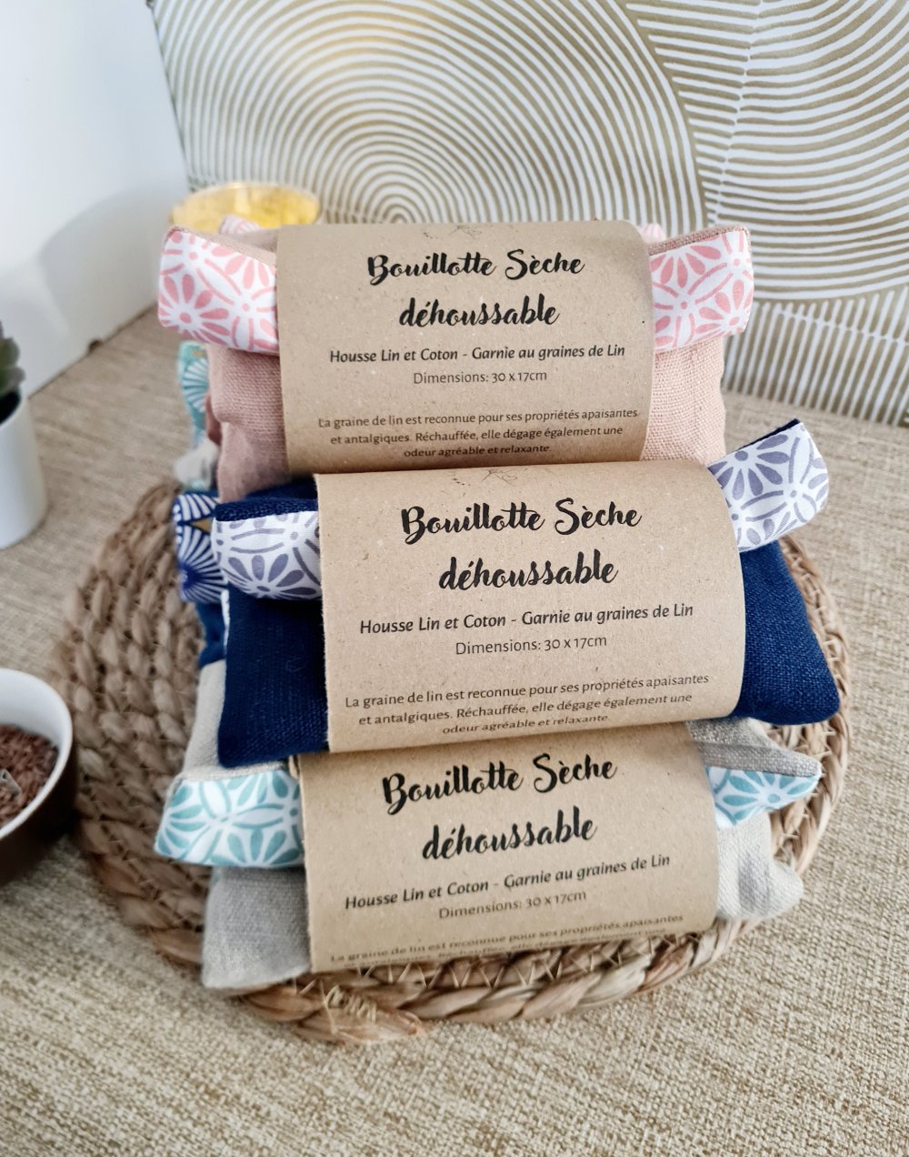 Bouillotte sèche passant au micro onde déhoussable garnie aux graines de lin. Housse en lin et coton