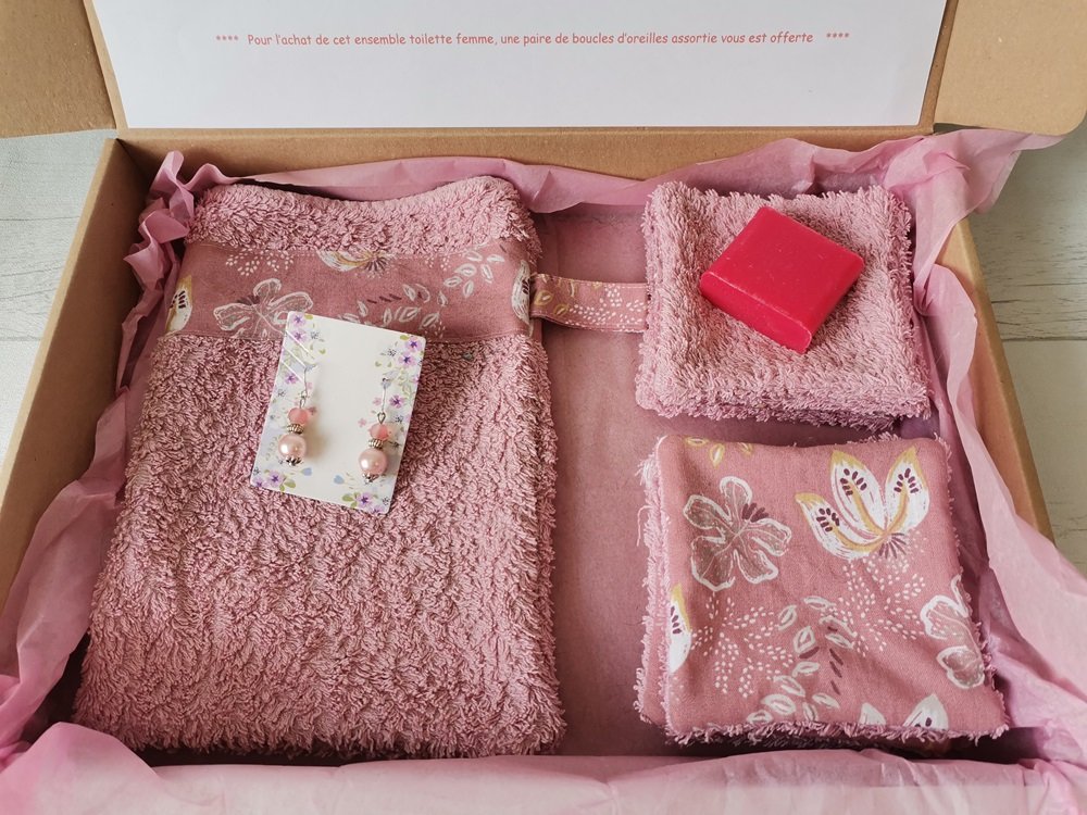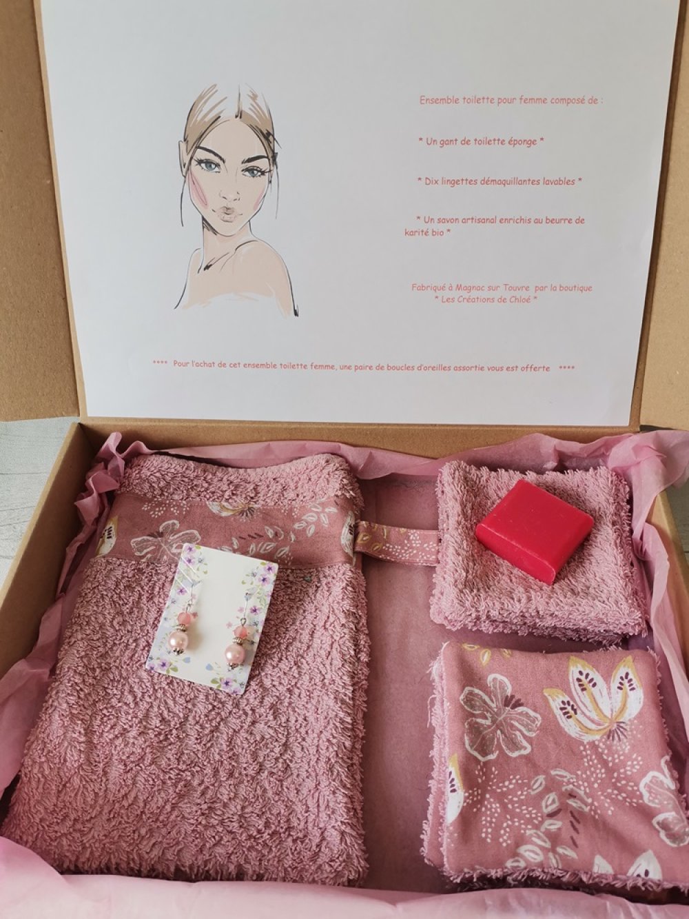 Cette box est composée d'un gant éponge, 10 lingettes démaquillantes en coton certifié Oeko-Tex et éponge et d'un savon de 30 g parfumé, fabriqué artisanalement en France et enrichis au beurre de karité bio. Pour l'achat de cette box, une paire de boucles d'oreilles aux couleurs assorties est offerte. Vendu avec sa boite en carton et emballé dans une feuille de papier de soie. Idéal cadeaux fête des mères et anniversaire.