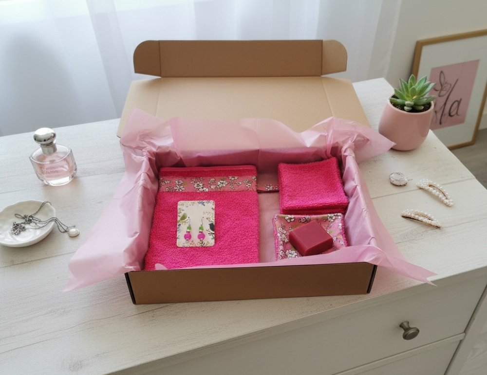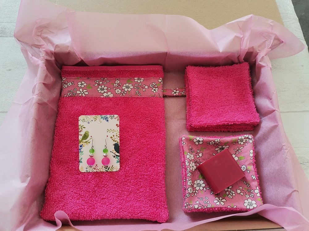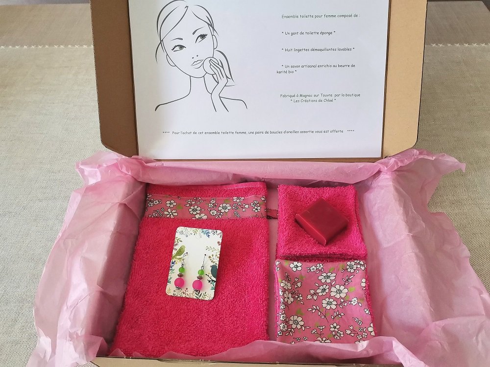 Cette box est composée d'un gant éponge, 8 lingettes démaquillantes en coton certifié Oeko-Tex et éponge et d'un savon de 30 g parfumé, fabriqué artisanalement en France et enrichis au beurre de karité bio. Pour l'achat de cette box, une paire de boucles d'oreilles aux couleurs assorties est offerte. Vendu avec sa boite en carton et emballé dans une feuille de papier de soie. Idéal cadeaux fête des mères et anniversaire.