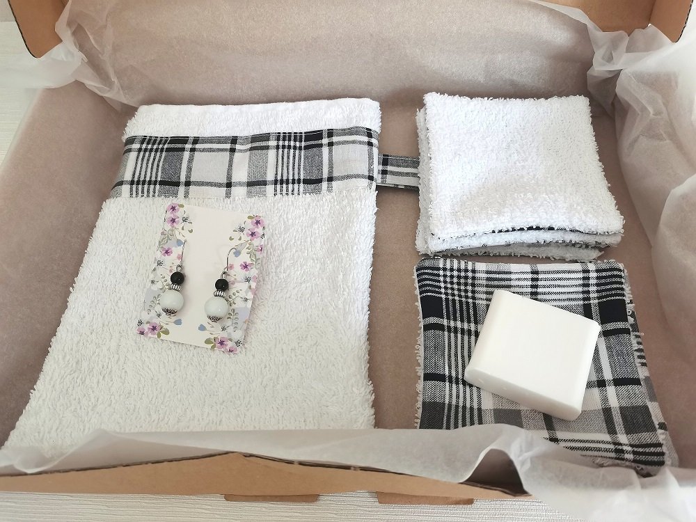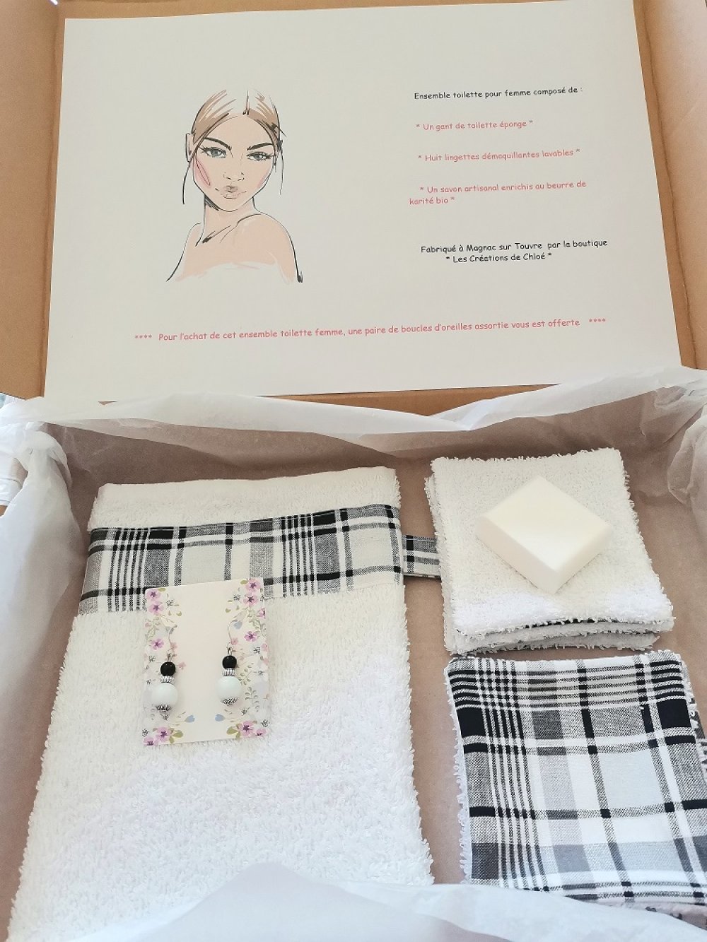 Cette box est composée d'un gant éponge, 8 lingettes démaquillantes en coton certifié Oeko-Tex et éponge et d'un savon de 30 g parfumé, fabriqué artisanalement en France et enrichis au beurre de karité bio. Pour l'achat de cette box, une paire de boucles d'oreilles aux couleurs assorties est offerte. Vendu avec sa boite en carton et emballé dans une feuille de papier de soie. Idéal cadeaux fête des mères et anniversaire.