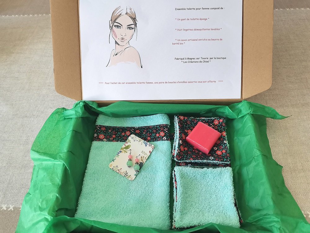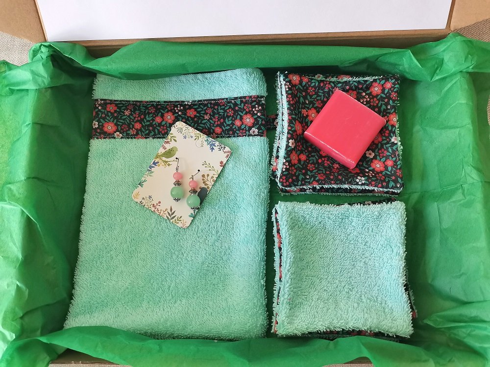 Cette box est composée d'un gant éponge, 8 lingettes démaquillantes en coton certifié Oeko-Tex et éponge et d'un savon de 30 g parfumé, fabriqué artisanalement en France et enrichis au beurre de karité bio. Pour l'achat de cette box, une paire de boucles d'oreilles aux couleurs assorties est offerte. Vendu avec sa boite en carton et emballé dans une feuille de papier de soie. Idéal cadeaux fête des mères et anniversaire.