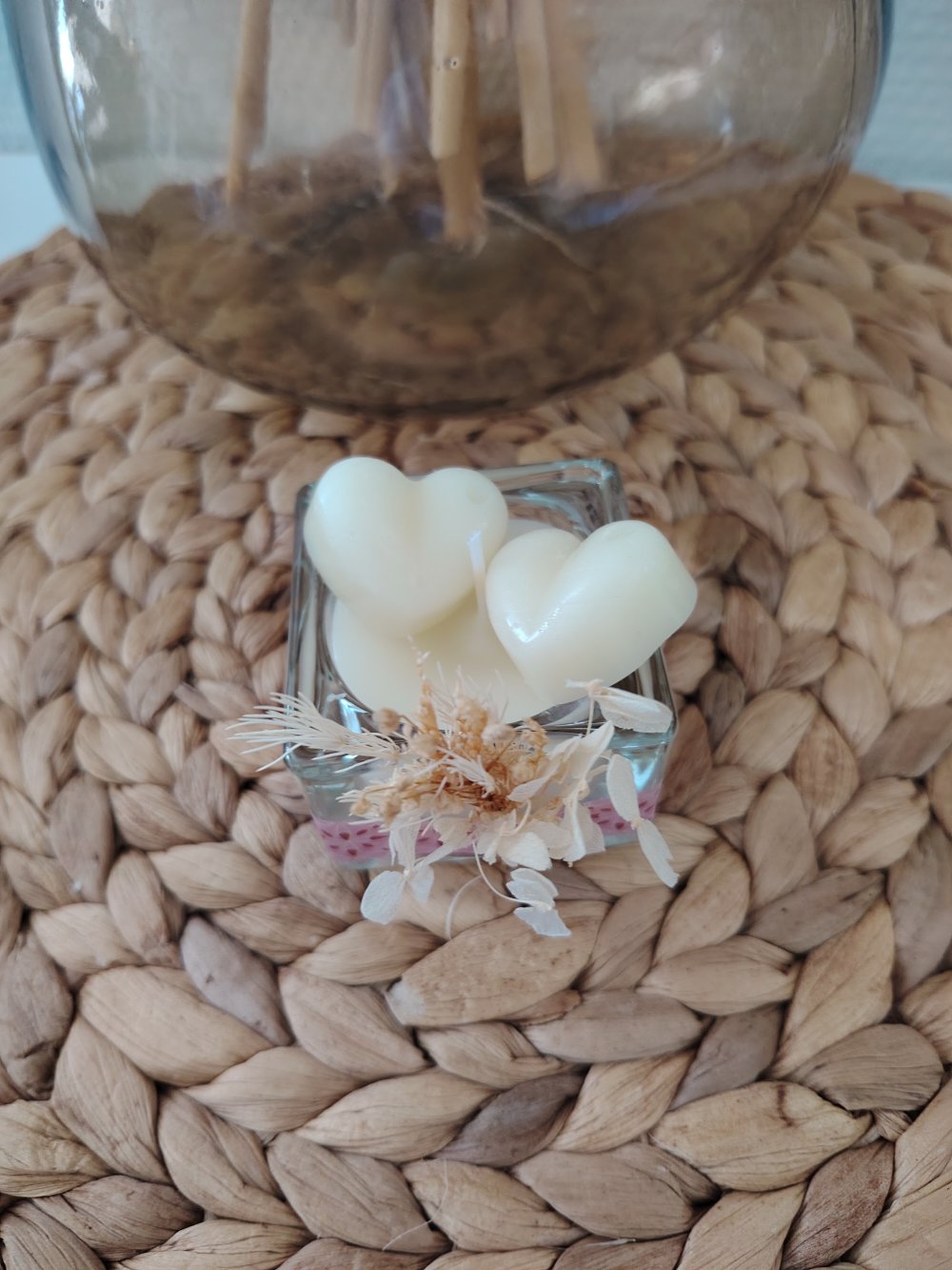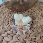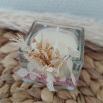 Petite bougie parfumée fait main à la rose et deux petits fondants à la rose et à la cire de soja ,orné d'un mini bouquet de fleurs séchées assortie d'un jolie contenant en verre .