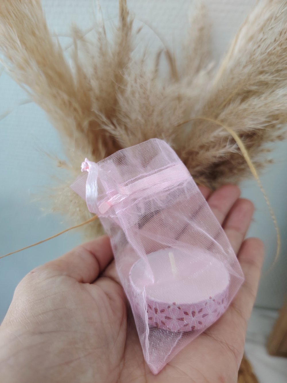 Une bougie chauffe plat à la rose habillée d'un ruban fantaisie en papier ,sera assorti à sa bougie .