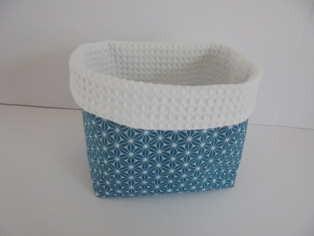 La panière est réalisées en tissu coton posée sur une épaisseur de thermocollant qui la rend rigide et la maintien en forme même vide avec l'intérieur en tissu nid d'abeille