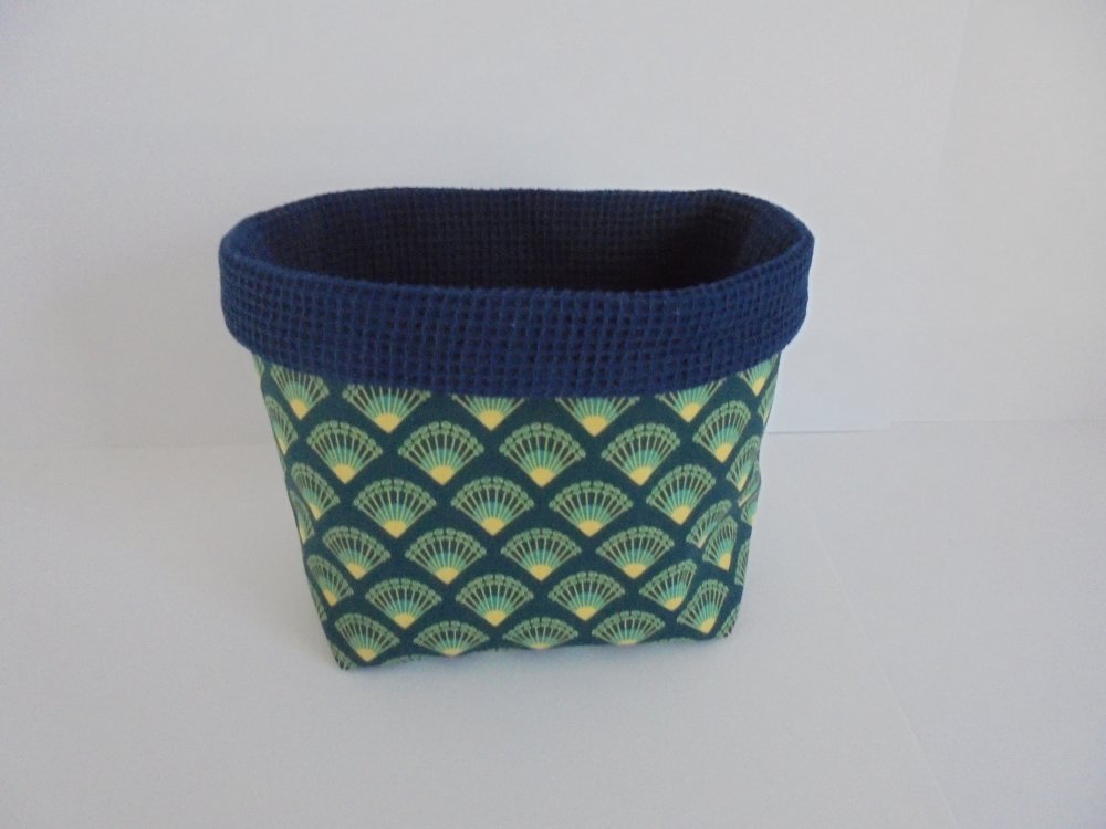 La panière est réalisées en même tissu posée sur une épaisseur de thermocollant qui la rend rigide et la maintien en forme même vide avec l'intérieur en tissu nid d'abeille bleu marine