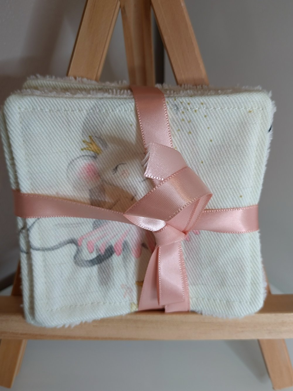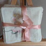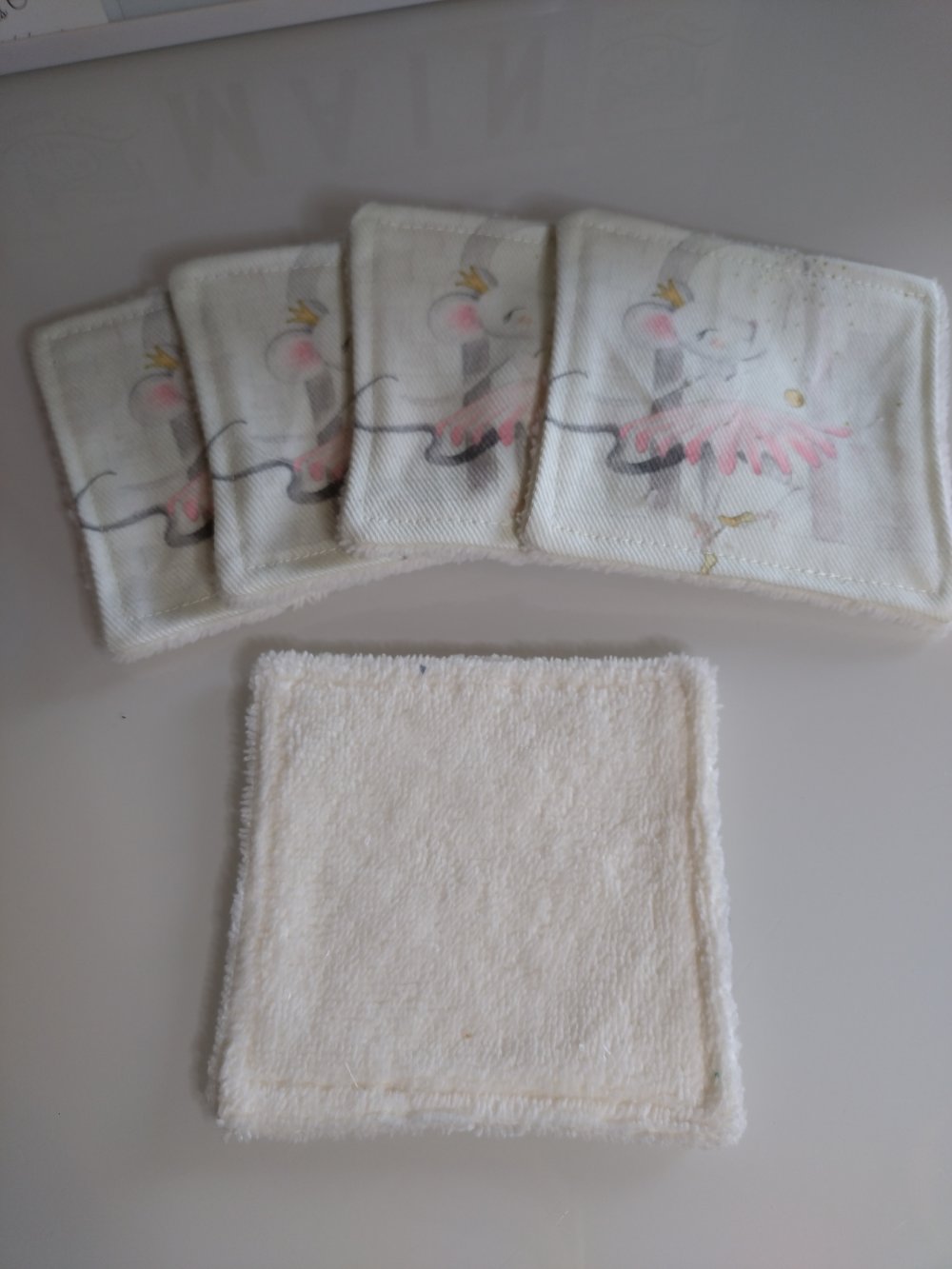 Les lingettes sont réalisés par une face en coton motif "Souris danseuse" et d'une face en éponge de bambou.