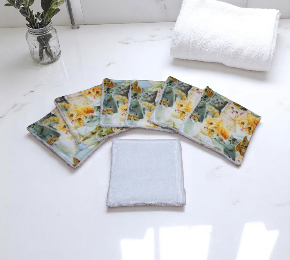 Lingettes x 7 en coton et éponge bambou modèle chat