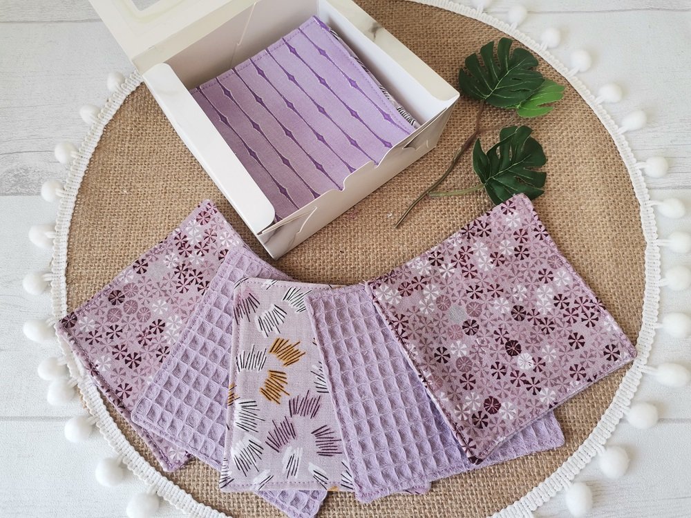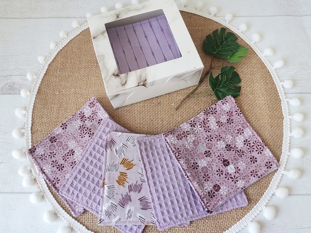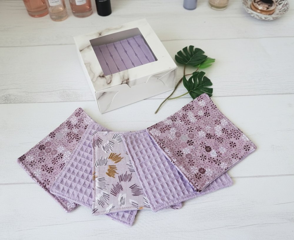 Lot de 12 lingettes démaquillantes pour femmes ton violet mauve avec 3 motifs différents