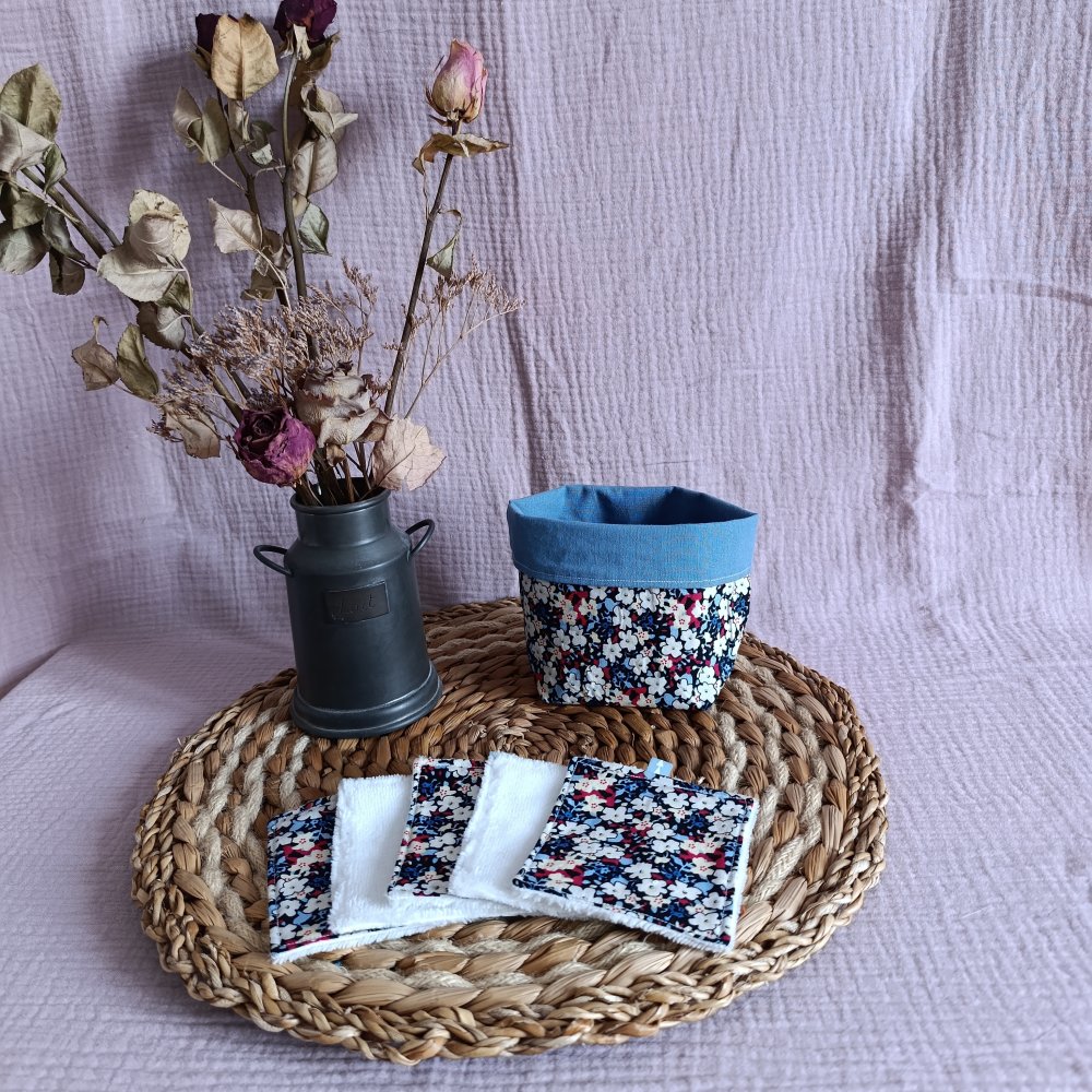 Panière + 5 Cotons Lavables Fleuris Rouge et Bleu