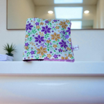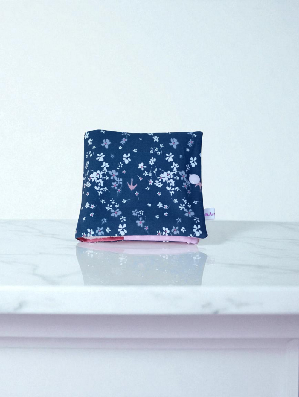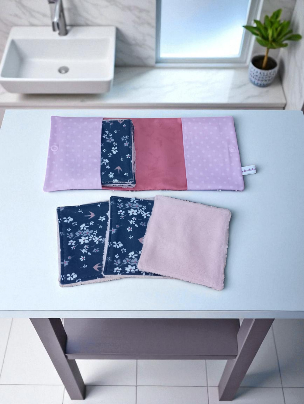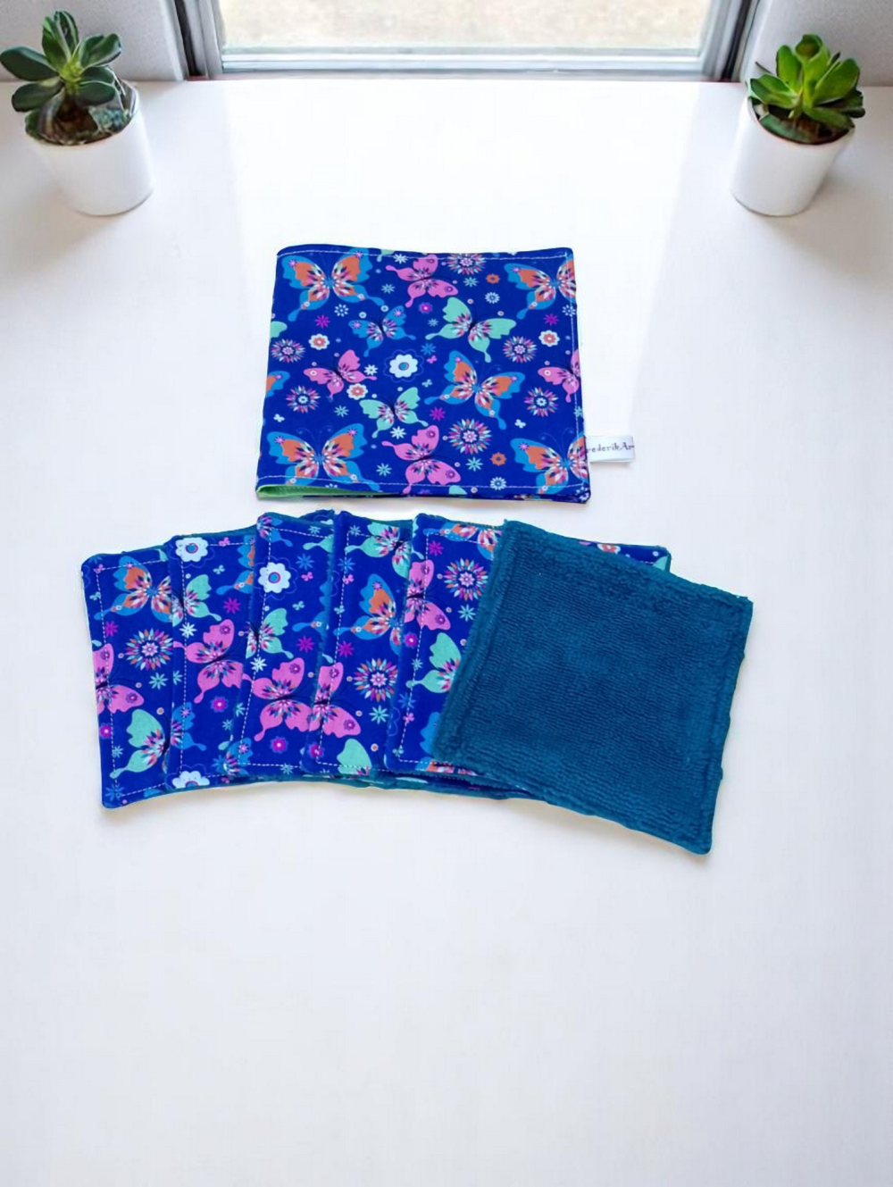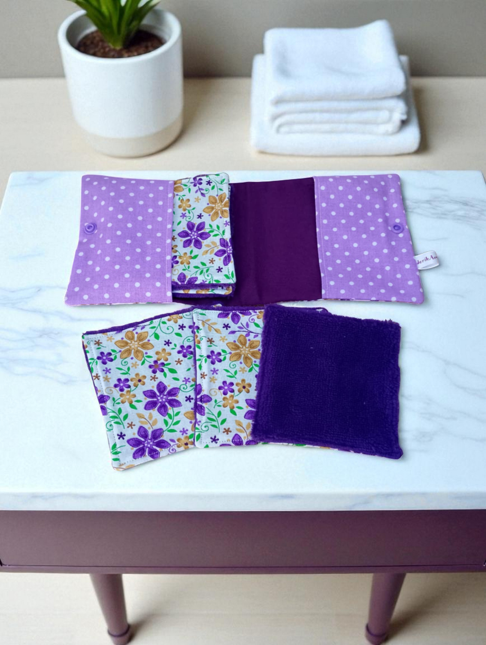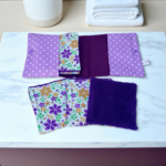 Pochette de 6 lingettes lavables. La pochette est fermée par bouton pression en résine. Elle est en coton et mesure fermée 14 x 13.5 cm.