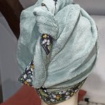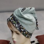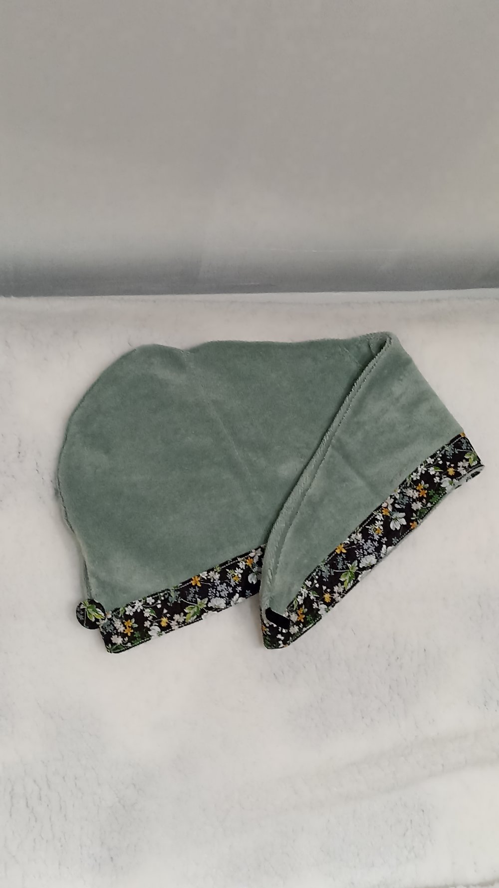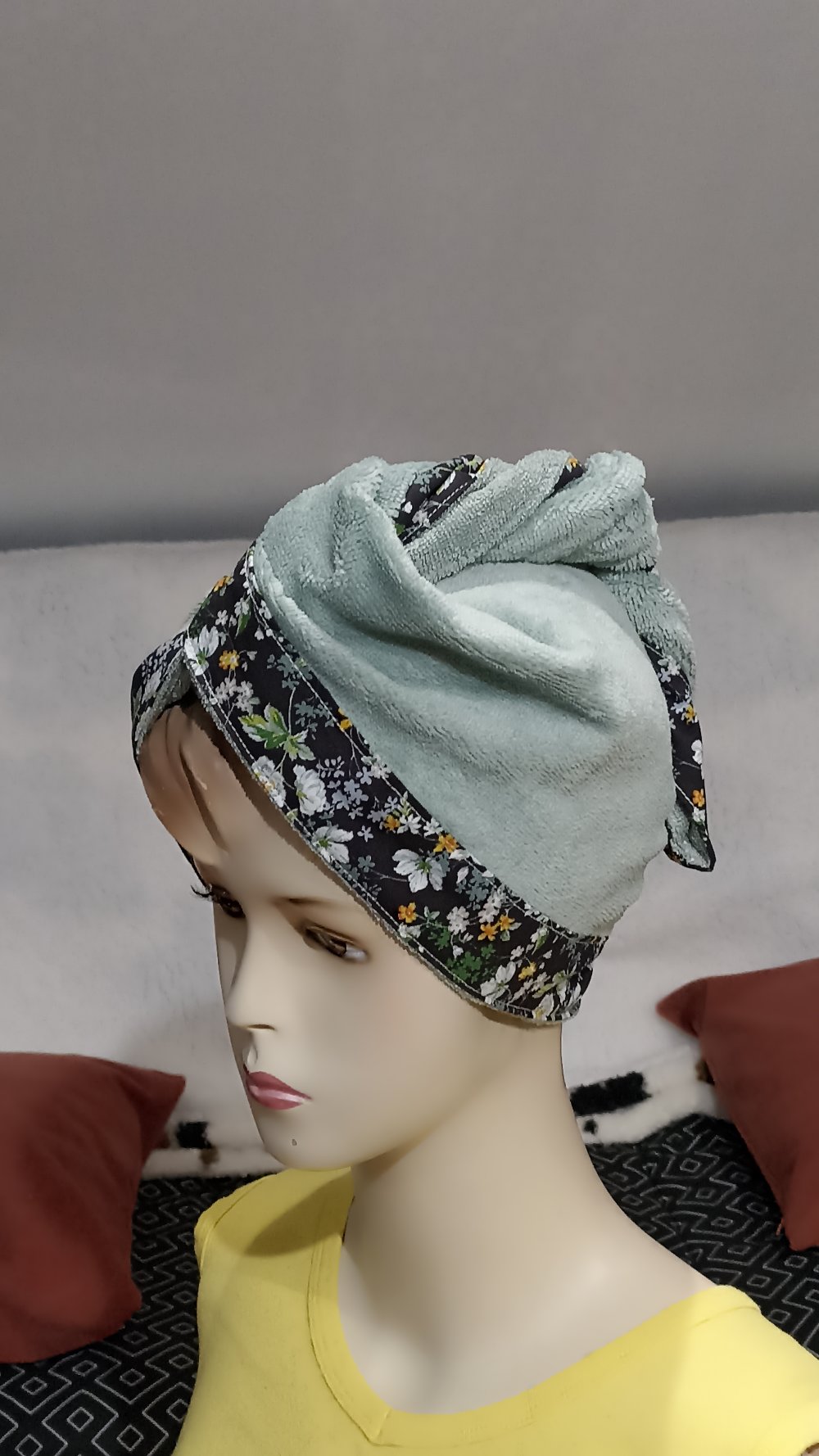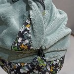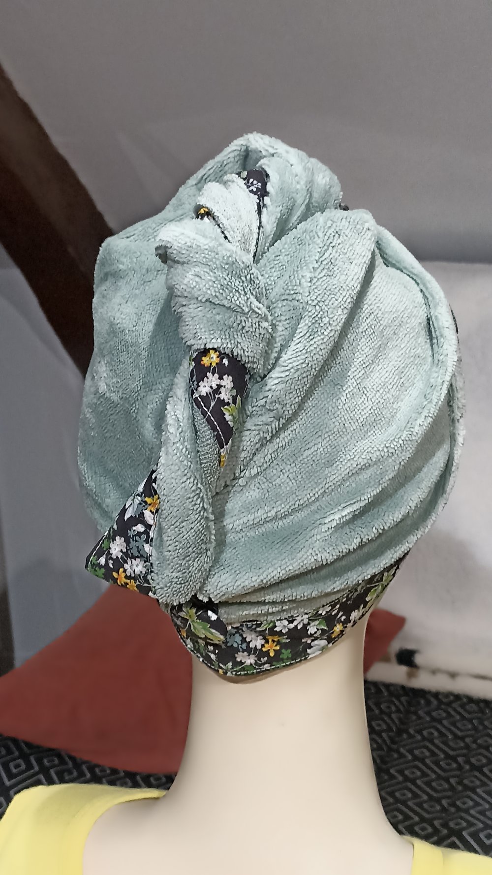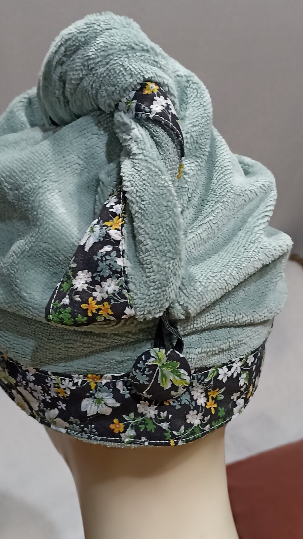 Turban de bain en éponge de bambou bordé d'un jolie tissu coton imprimé