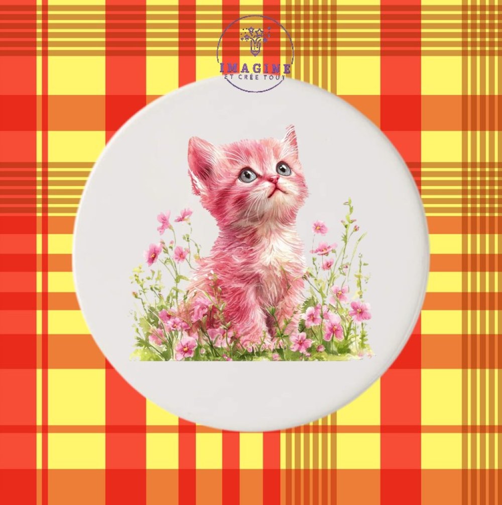 Sous verre en céramique - sublimation - châton rose - fleurs - couleurs - animal - prairie - chat - jardin fleuri
