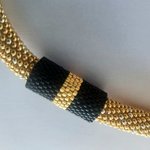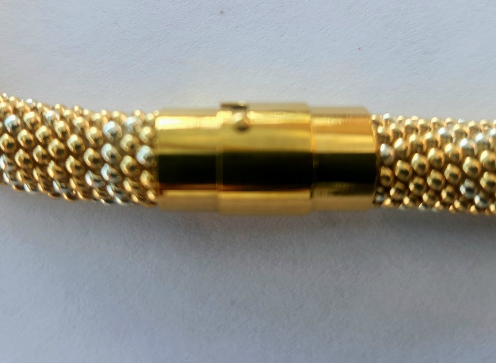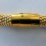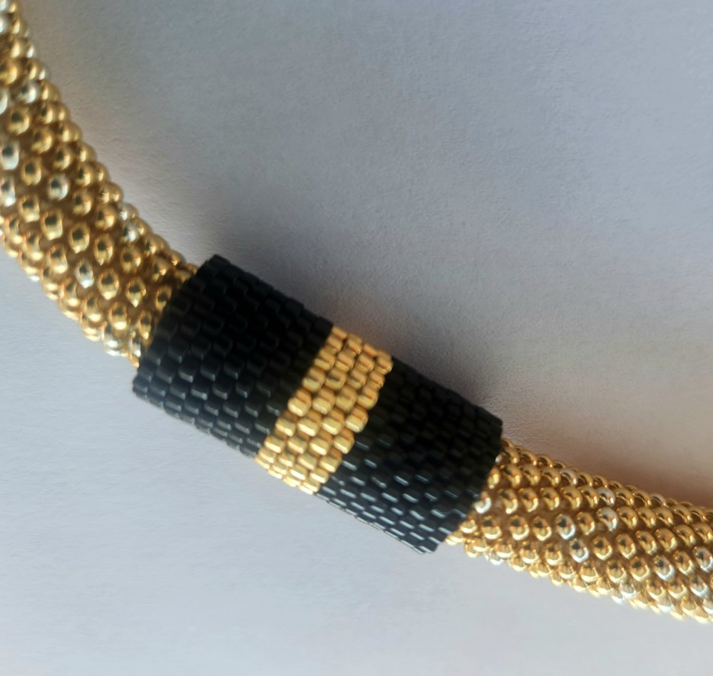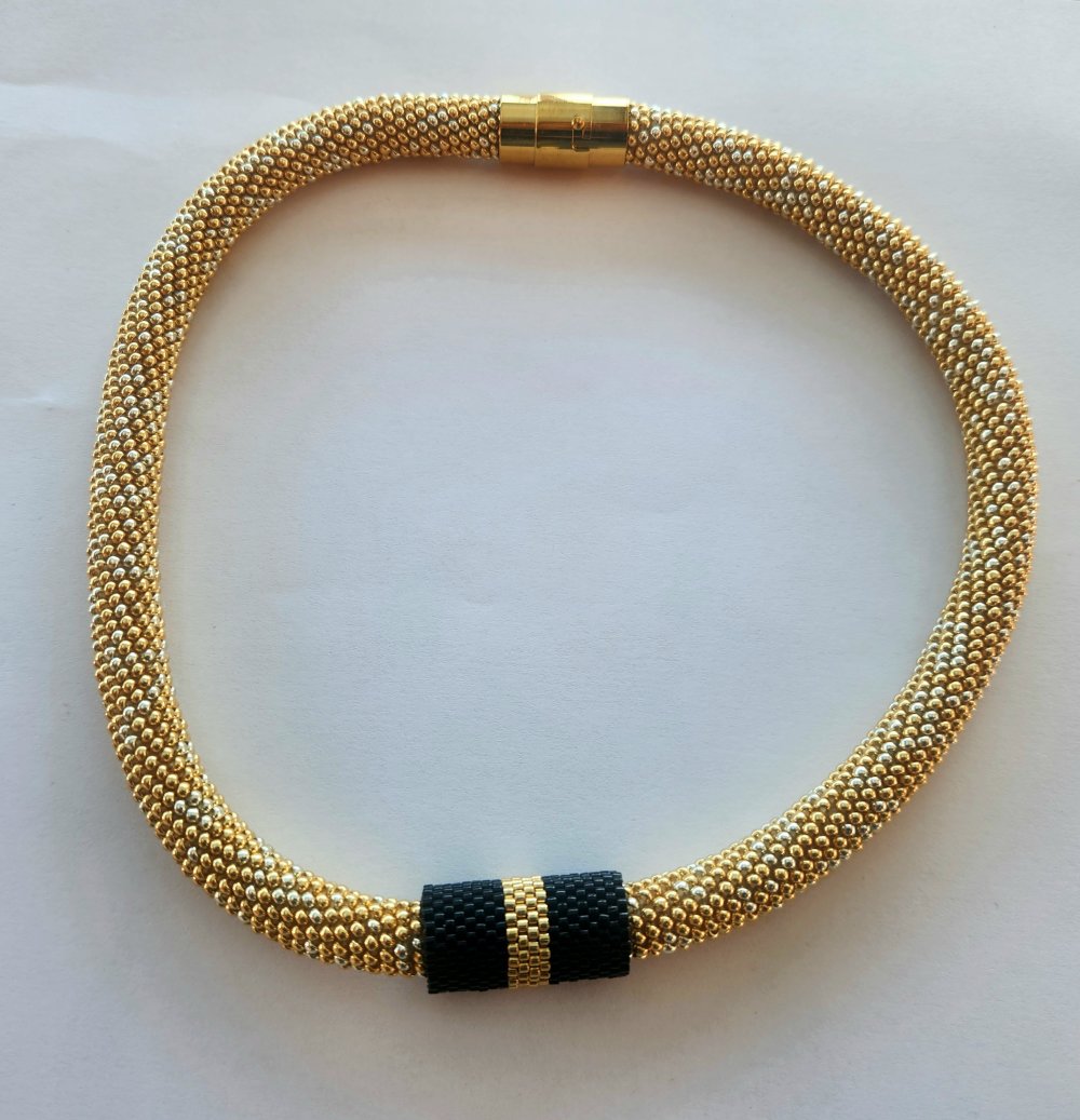 Un mix de rocailles couleur or et argent, monté en spirale crochetée. Il est souple et léger.