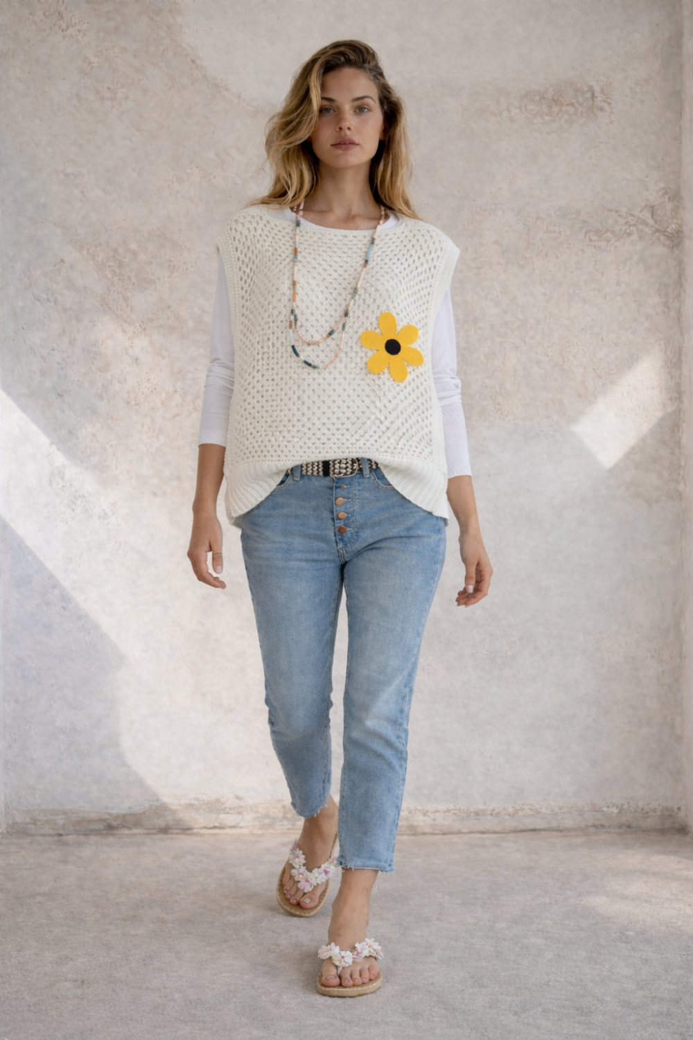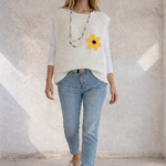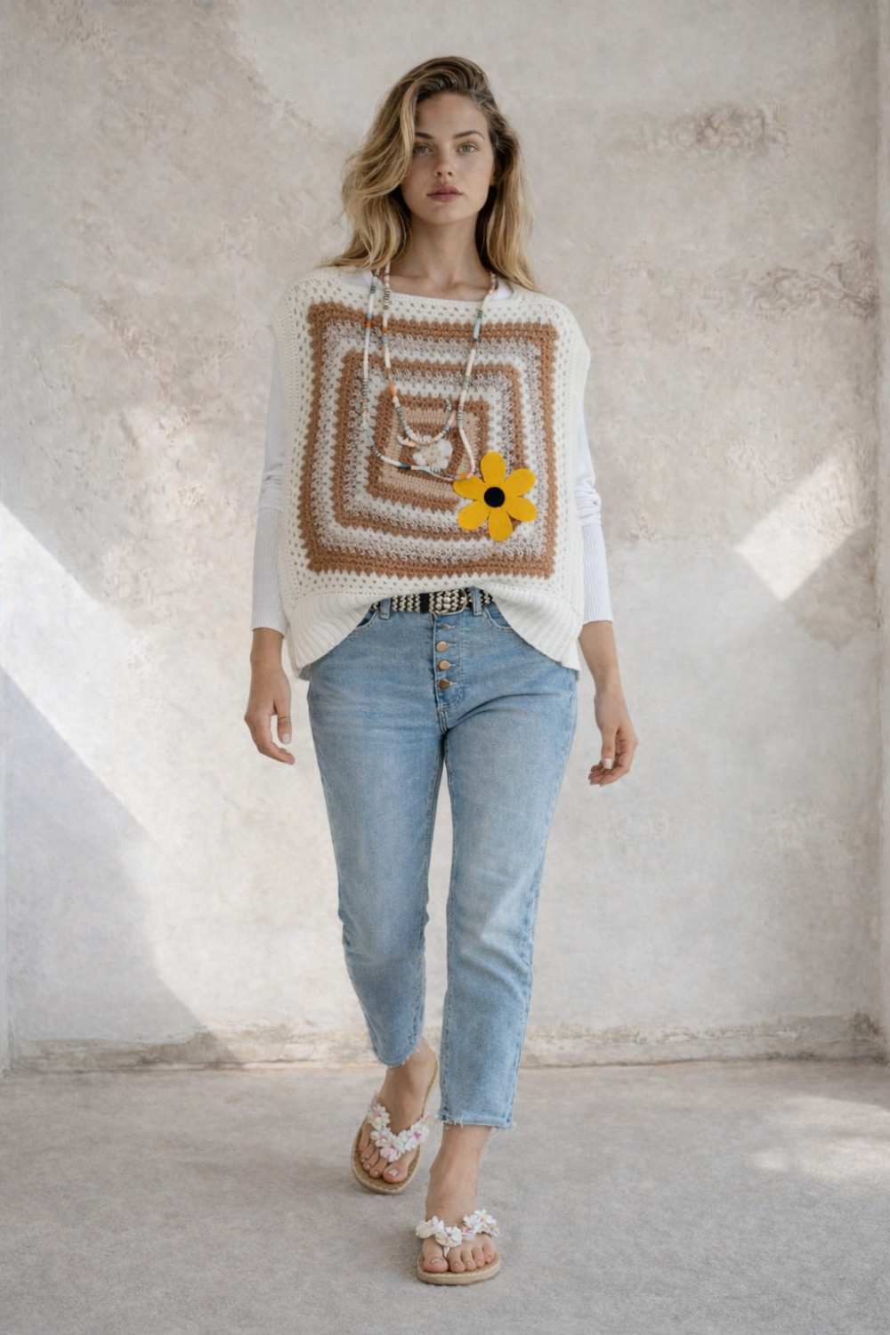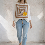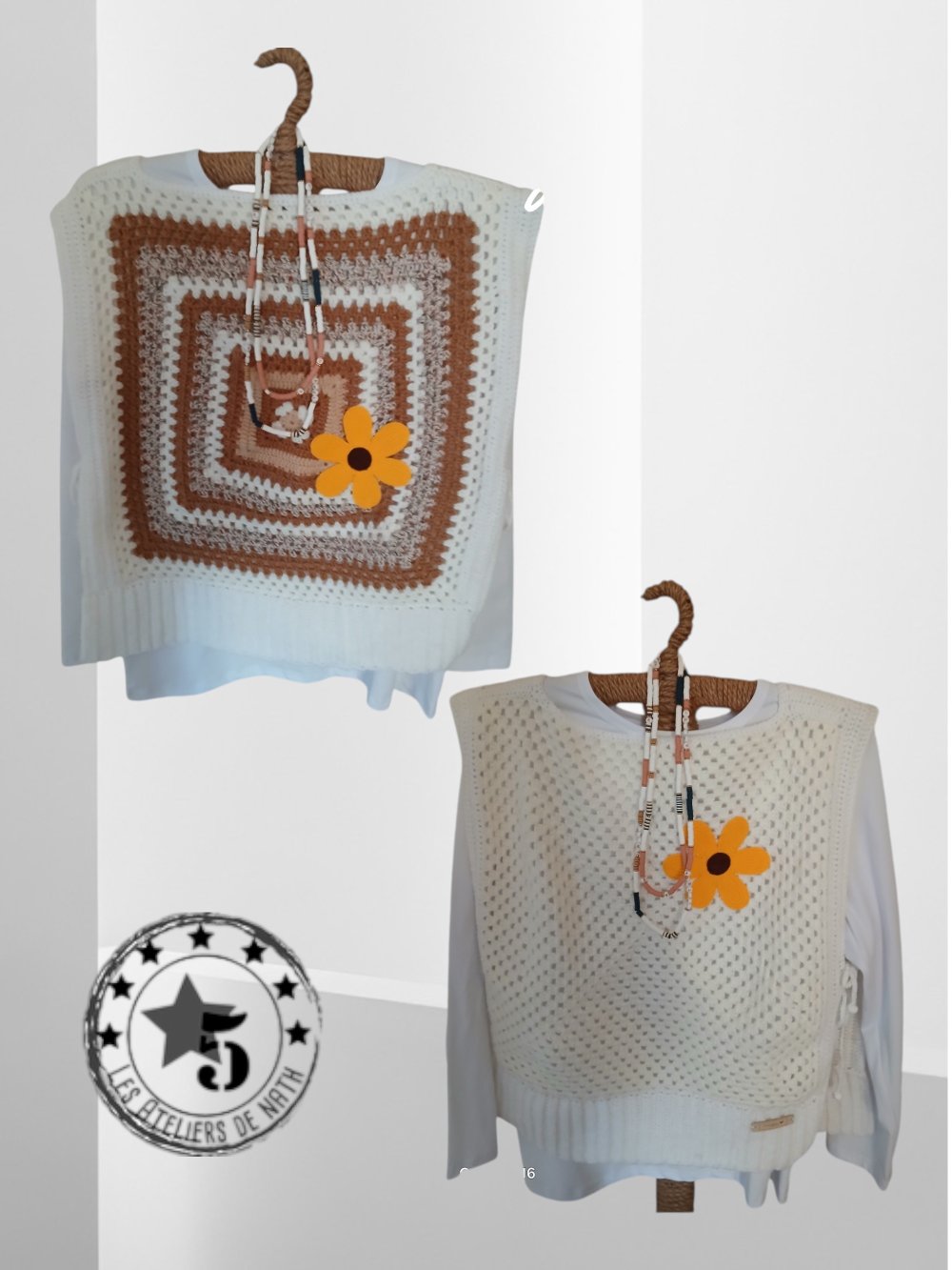 Sur pull au crochet, motif granny coloré, s'attache avec des nouettes de chaque côté sur sup pull. Il est réversible vous pouvez le porter selon votre envie.