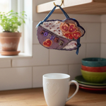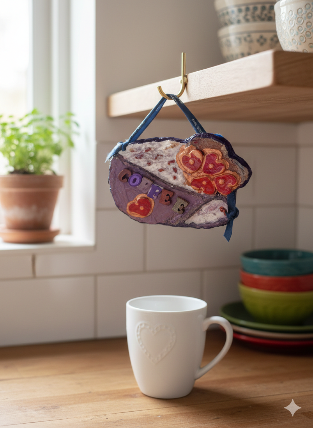 Le contraste entre les teintes violettes profondes, les éclats de rouge passion des cœurs et le mot "COFFEE" en relief crée une atmosphère conviviale et artistique. Suspendue à une étagère, une poignée de buffet ou près de votre machine à café, elle attire l'œil et réchauffe l'ambiance de la pièce.