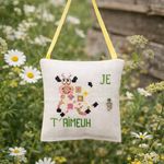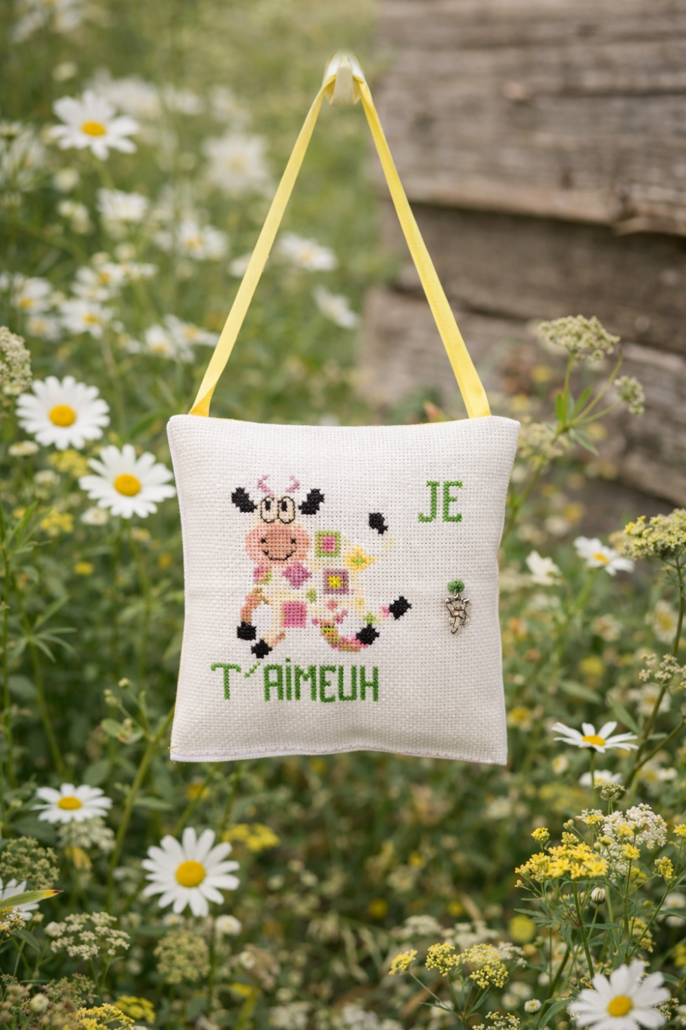 entièrement fait main sur de la toile aïda recouvert d'un tissus vert clair au dos avec un jolie ruban jaune en satin pour la suspendre et accompagné d'une petite breloque fleur accroché dessus .