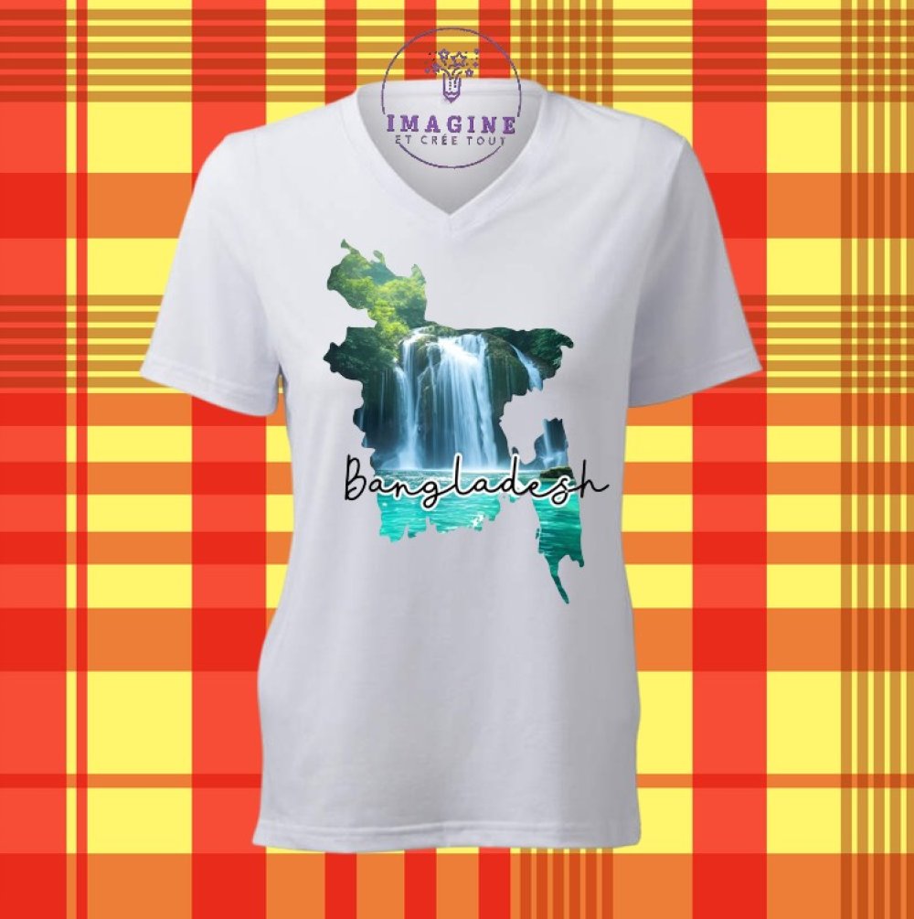 T-shirt personnalisé pour femme - col V - sublimation - bangladesh - cascade de madhabkund - carte