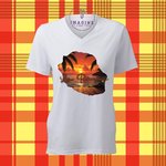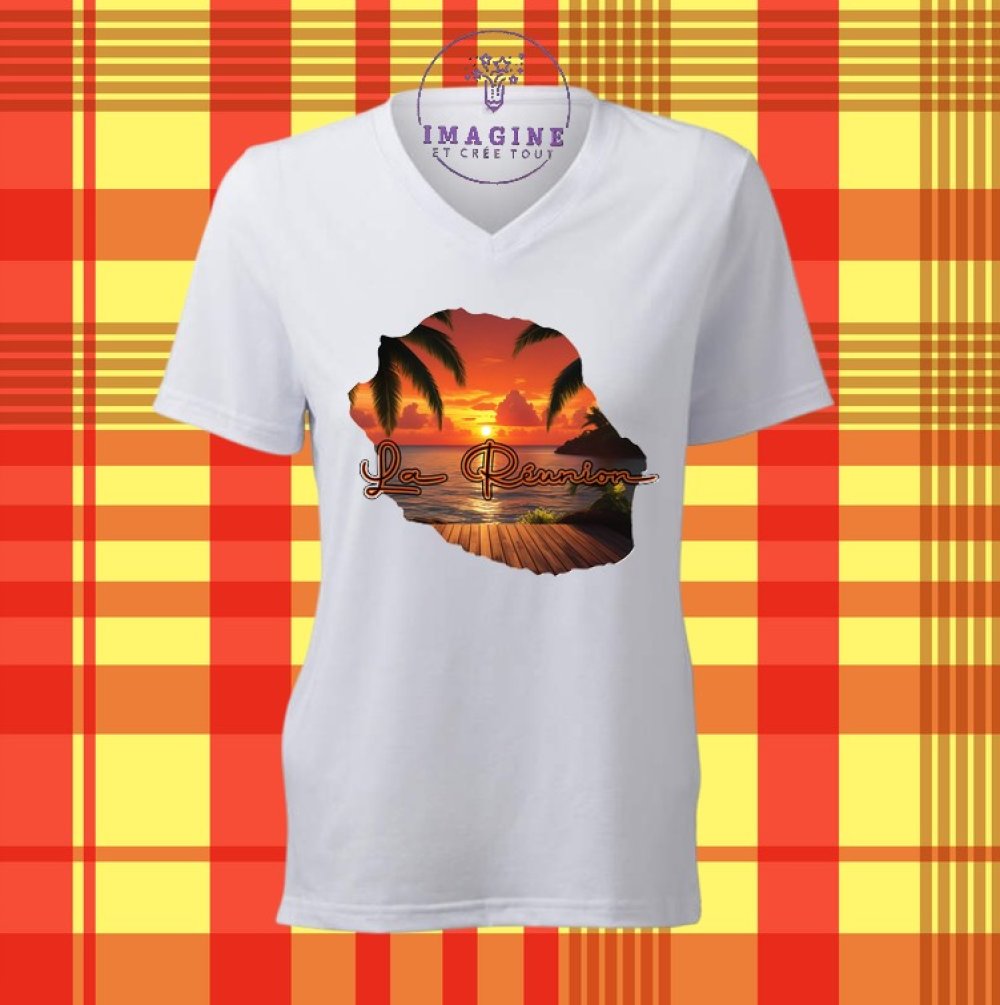 T-shirt personnalisé pour femme - col V - sublimation - carte île de la Réunion - couché soleil - 974 - paille en queue