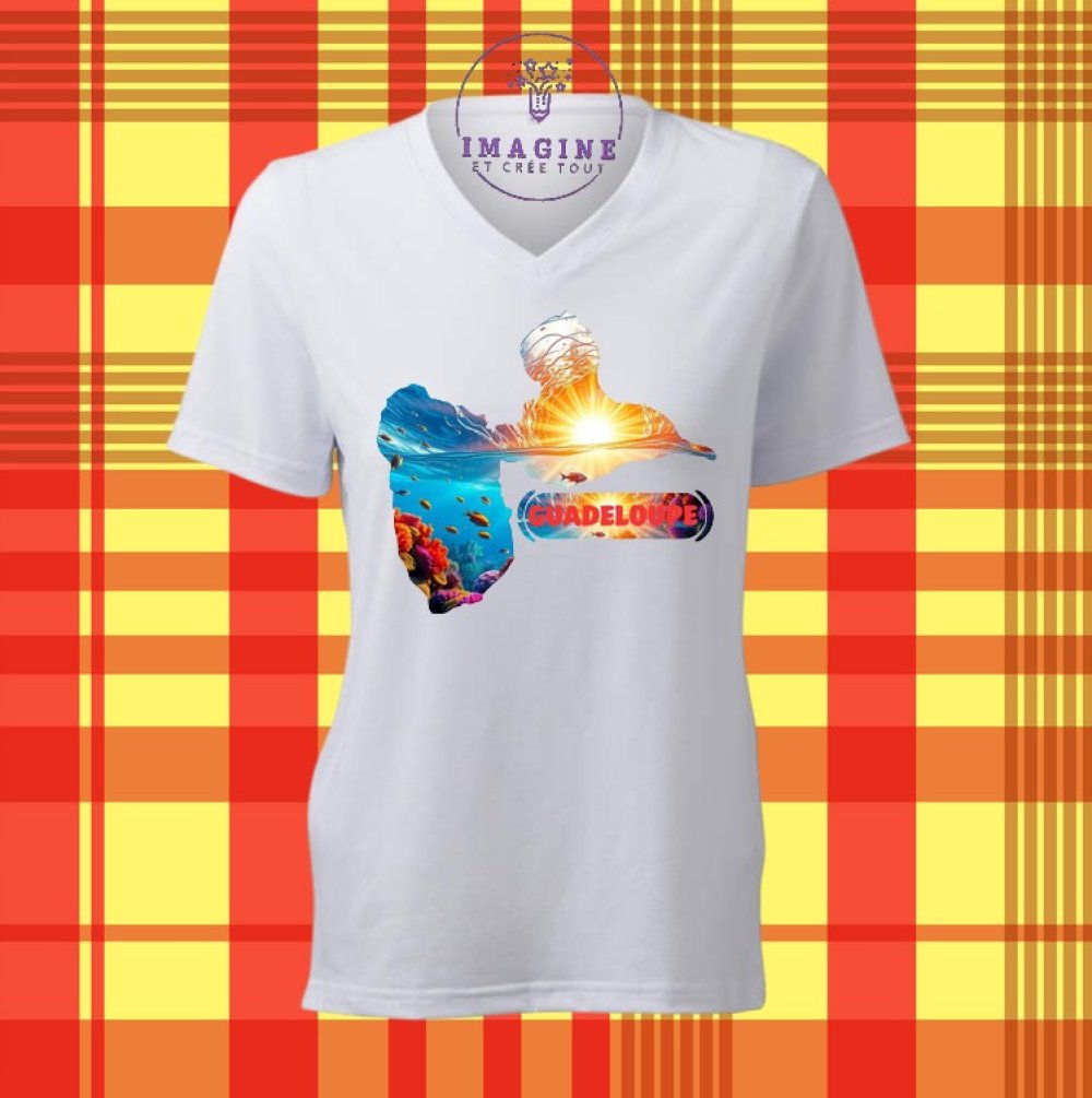 T-shirt personnalisé pour femme - col V - sublimation - guadeloupe - fond marin - 971 - karukera - tropique - île - carte