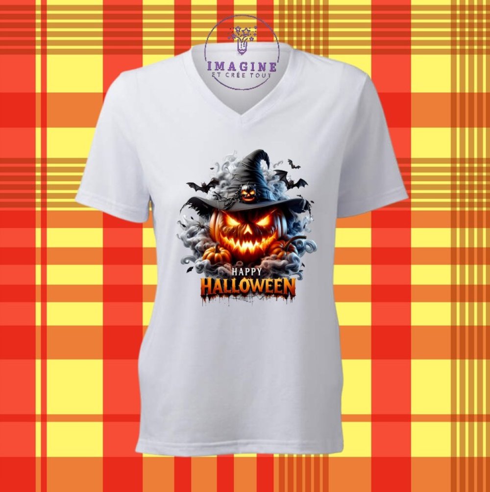 T-shirt personnalisé pour femme - col V - sublimation - halloween - citrouille - bonbons - fantôme - chauve-souris