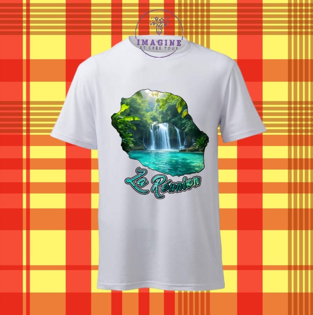 T-shirt personnalisé pour homme - ras du cou - sublimation - carte île de la réunion - cascade - paille en queue - 974
