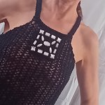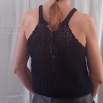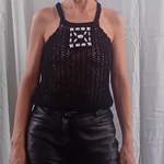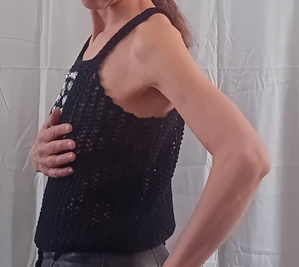 Top pour femme, taille 38/40, couleur noir, tricoté main. Il est tricoté en une maille filet pour une transparence d'esprit "camouflage", avec des sequins cousus en forme de bijoux sur le devant, emmanchures américaines, finitions au point mousse. Il est réalisé en qualité Capture de Phildar (85% coton, 15% polyester), coloris noir, aiguilles n° 6 et crochet n° 4.
