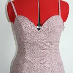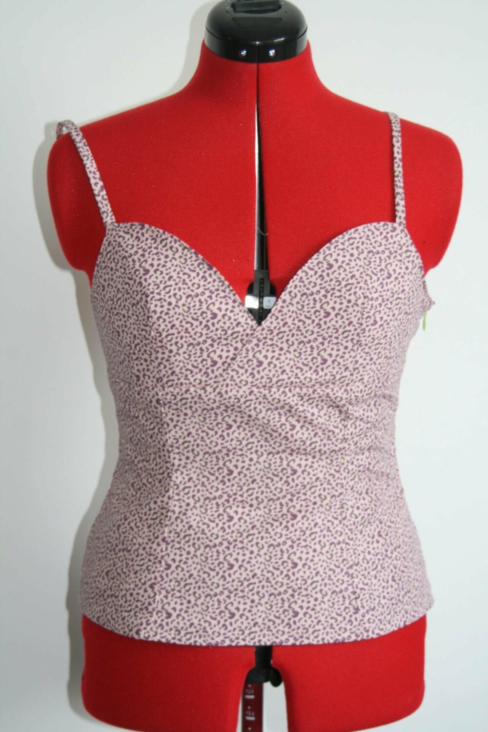 Petit top sexy à bretelles en coton léopard rose avec taches violettes et vertes . Se ferme sur le côté avec un zip vert .