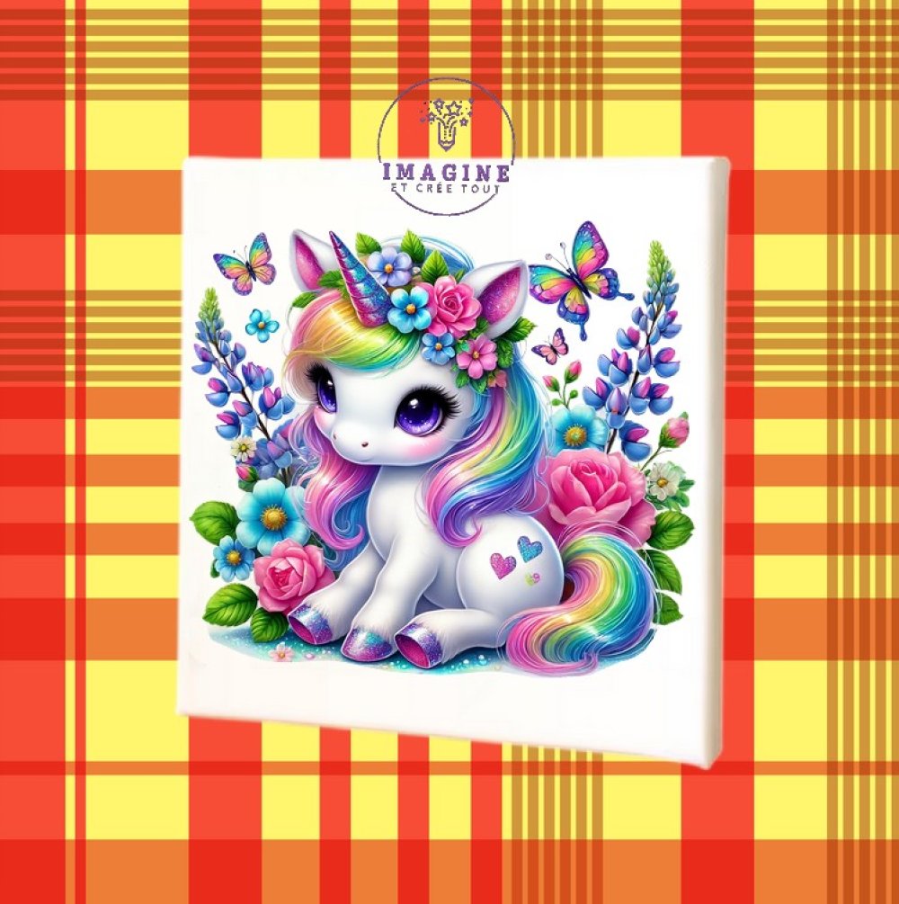 Tableau mural - sublimation - impression infusible ink - toile - canvas - licorne - corne - papillons - coeurs - rosier - fille