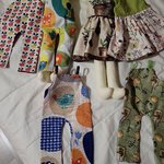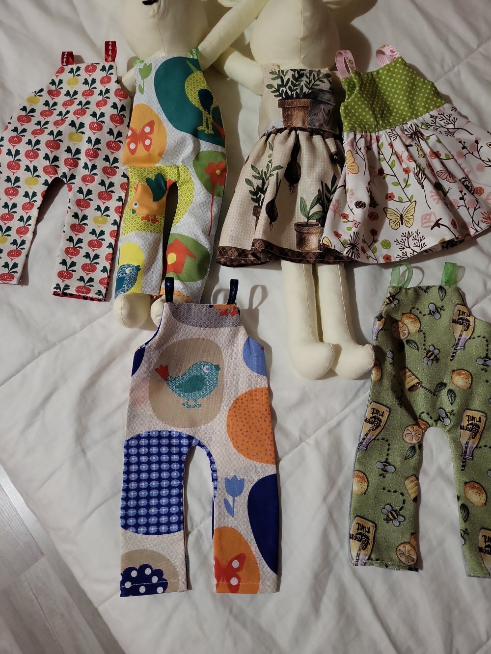 Lapins en tissu avec leurs robes, entourés de plusieurs tenues colorées (combinaisons et vêtements à motifs).