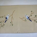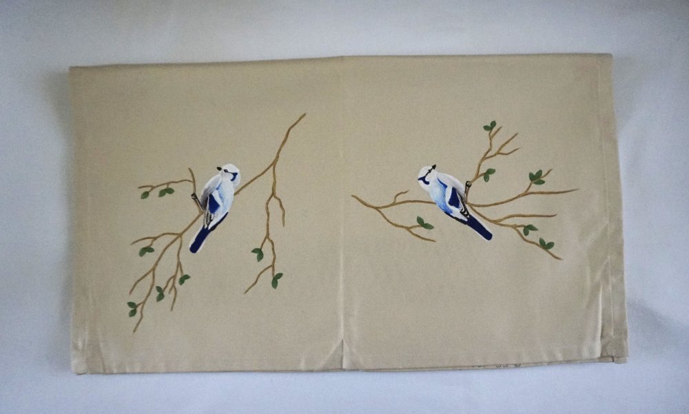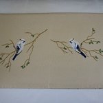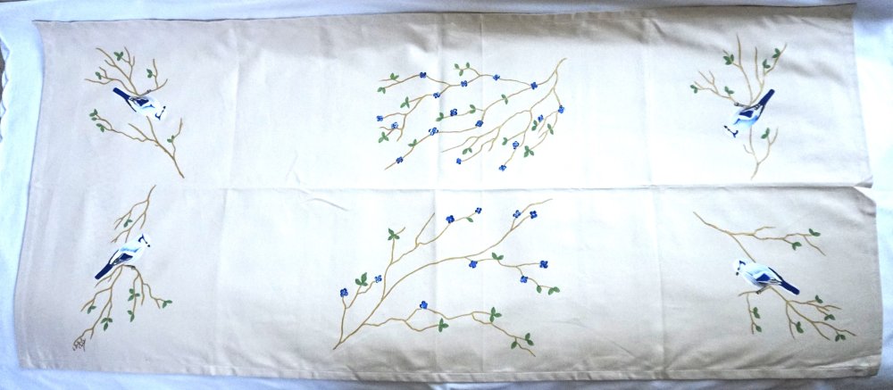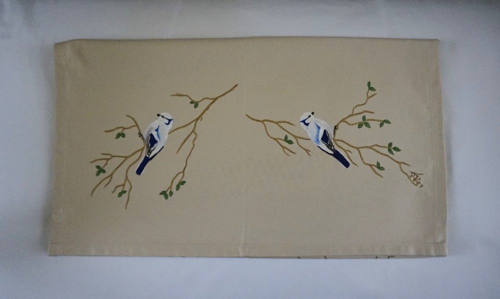 Chemin de table en coton beige avec comme motif 4 mésanges azurées sur leur branche, peint à la main. La peinture est fixée au fer chaud et ne bouge pas.