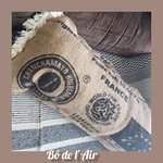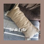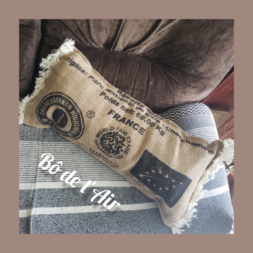 Coussin cale-dos, ou cervicales, confectionné à partir d'une toile de jute de café du Guatemala, écritures couleur noire, bordures des côtés du coussin galon frange beige pour un style bohème ou indus. Rembourrage du coussin en ouate de polyester. La toile de jute a été surfilée avant couture, afin d'éviter les risques d'effilochage.
