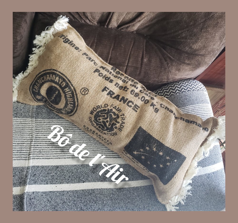 Coussin cale-dos, ou cervicales, confectionné à partir d'une toile de jute de café, joli motif de bateau, couleur noir, bordures des côtés du coussin galon frange beige pour un style bohème ou indus. Rembourrage du coussin en ouate de polyester. La toile de jute a été surfilée avant couture, afin d'éviter les risques d'effilochage.