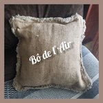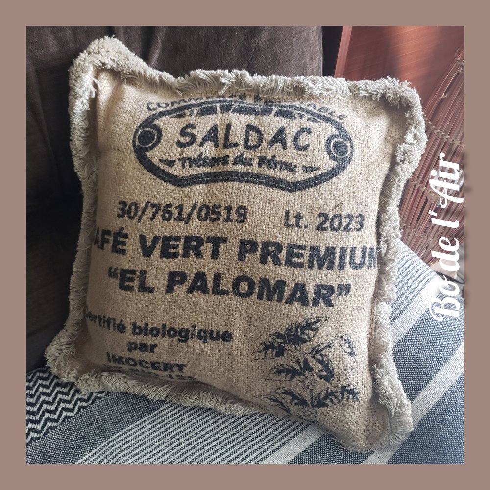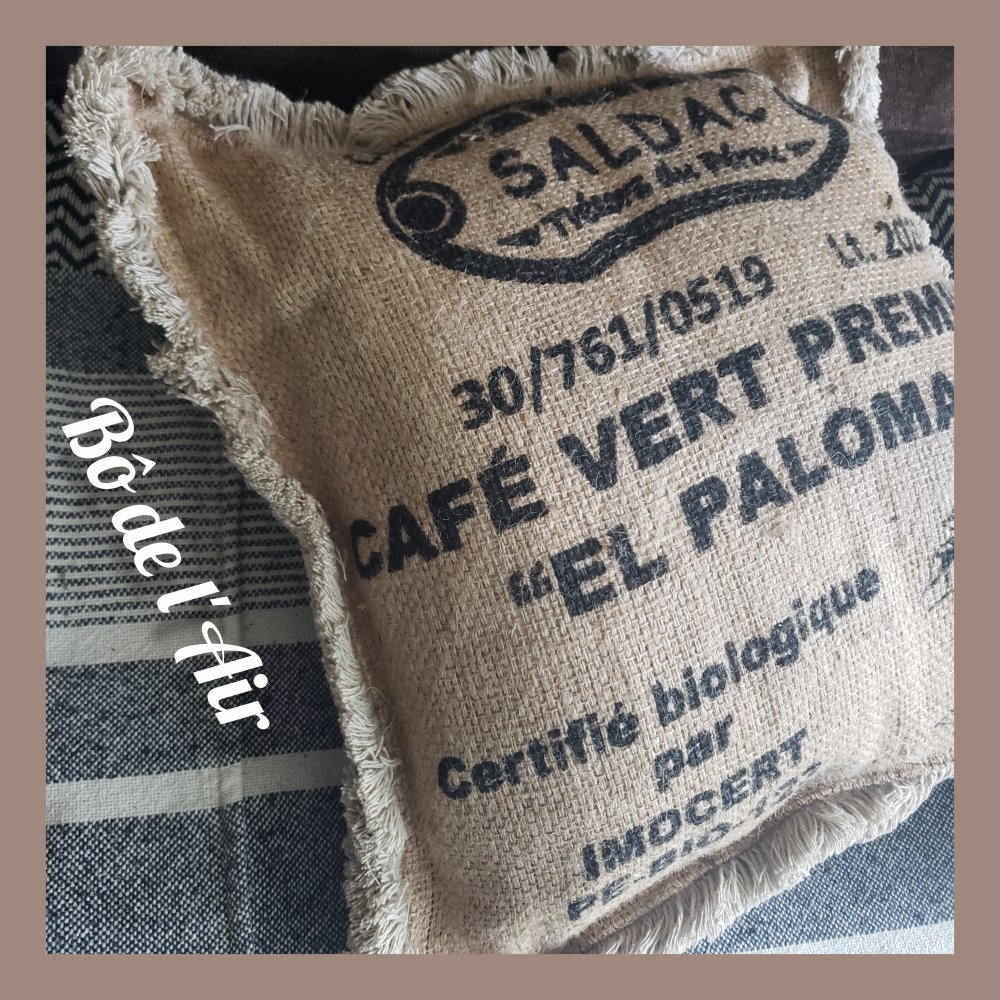 Coussin en toile de jute revalorisée , café vert "el paloma" écritures noires , joli galon frange beige tout autour pour un esprit bohème. Remplissage du coussin avec un coussin blanc et rembourrage polyester. Le coussin est non déhoussable, mais un lavage en machine température 30 , et un essorage à minima pour ne pas altérer la toile et les franges, est recommandé. La toile de jute a été surfilée avant couture, afin d'éviter les risques d'effilochage.