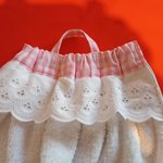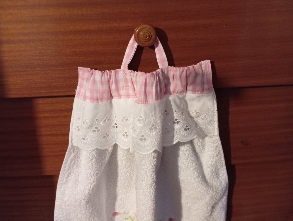 broderie sur le bas vert et rose , en haut fronces avec rajout de broderie anglaise blanche et tissu coton vichy rose et blanc, lien pour accrocher . poids 140 g