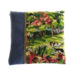 Ce canevas vintage représentant une chasse à courre retrouve une seconde vie appliqué sur cette élégante housse de coussin en velours bleu jean de dimensions 42 X 42 cm, fermée par zip sur le côté.