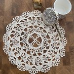 J'ai réalisé ce napperon à la main avec un fil 100% coton écru. J'ai opté pour une succession de parties pleines et parties ajourées pour former des jolies arabesques et pétales en m'inspirant des rosaces anciennes. J'ai terminé par des bordures festonnées et finement ondulées.
