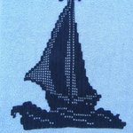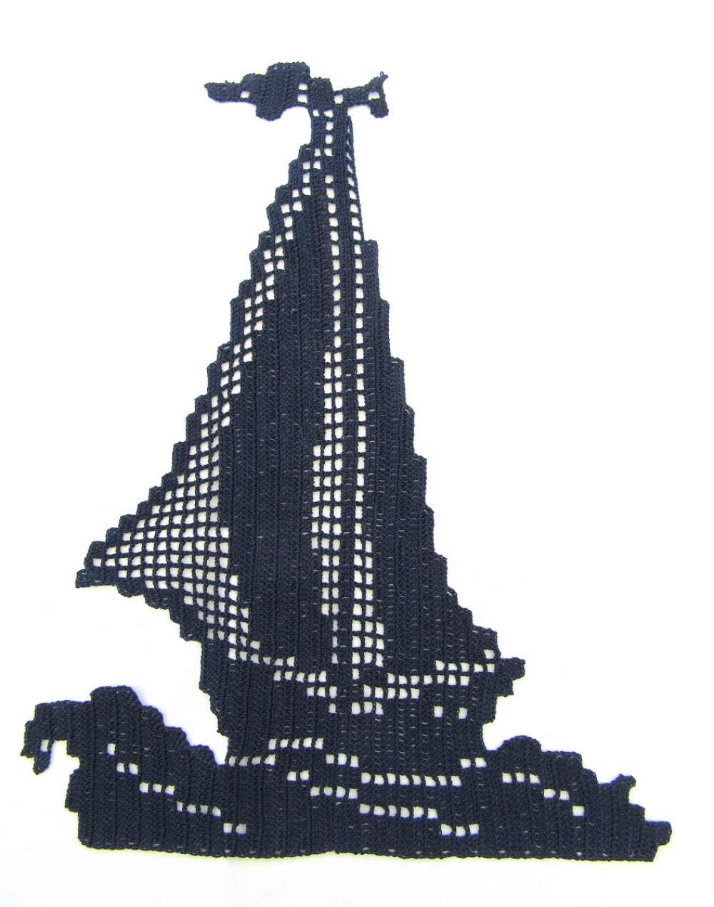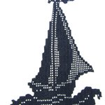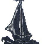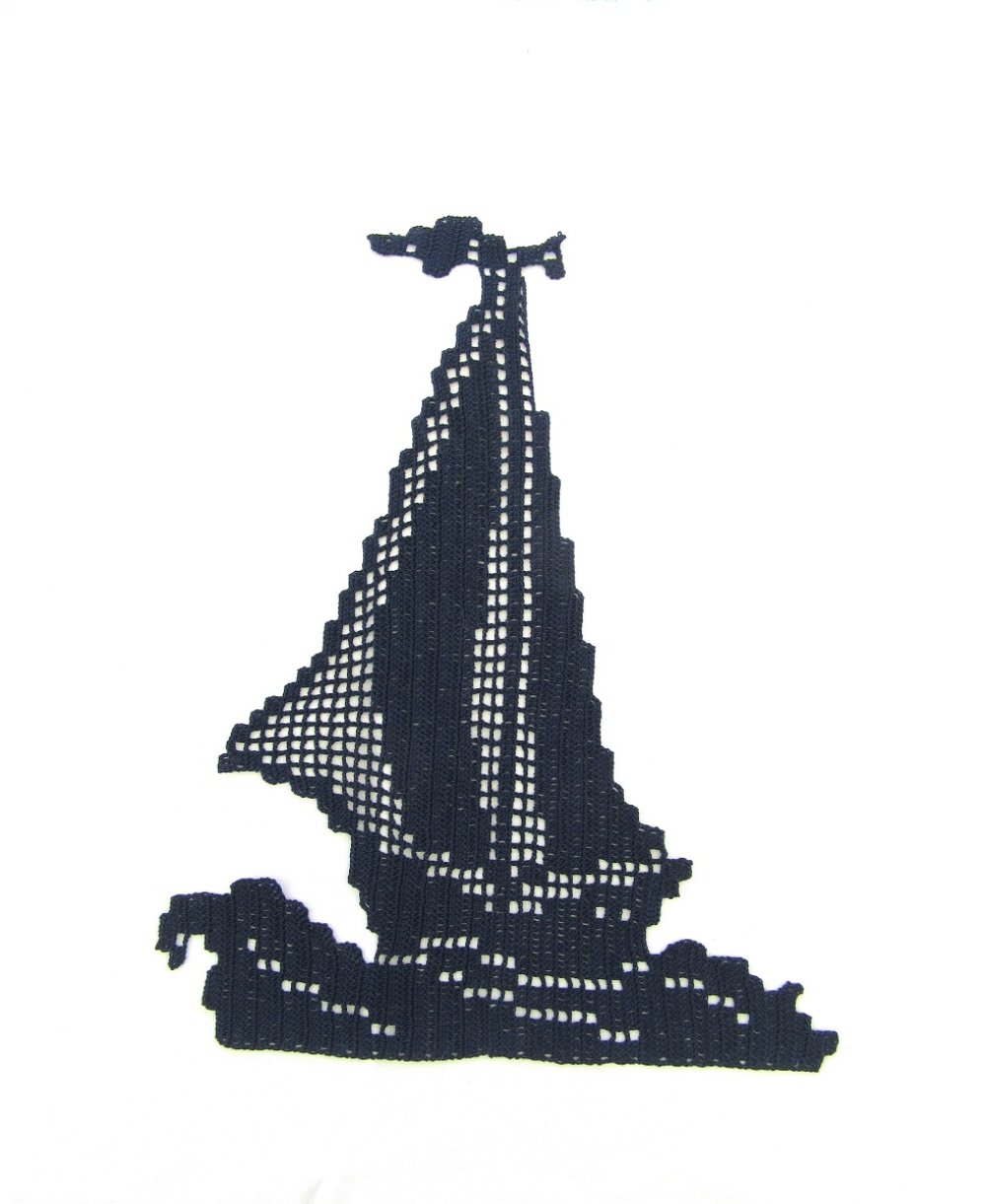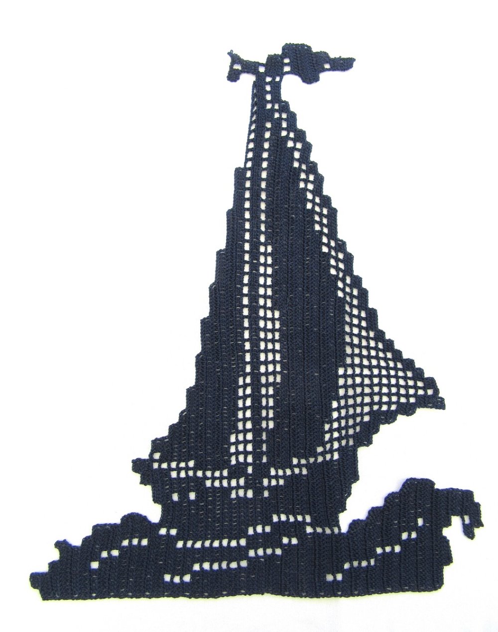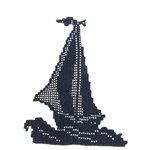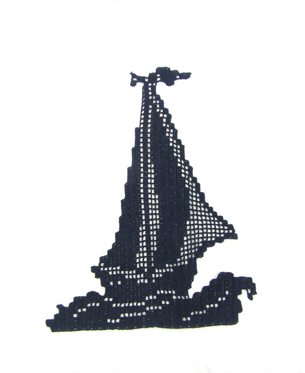 Napperon style marin : voilier au crochet en coton bleu. Textile décoratif.