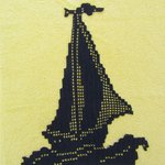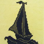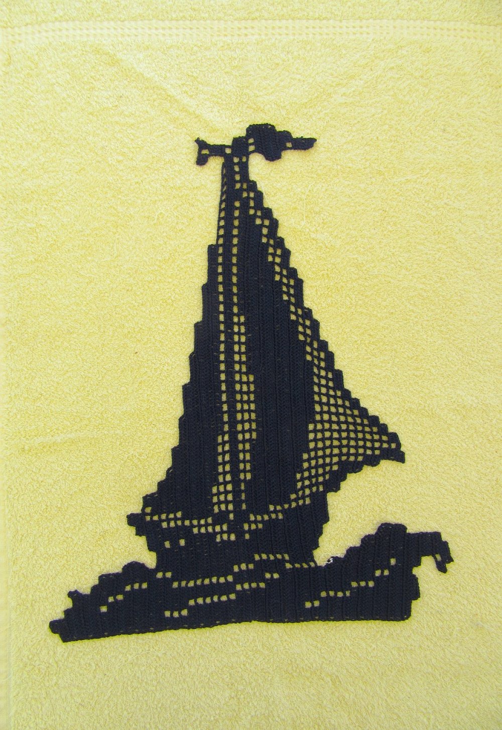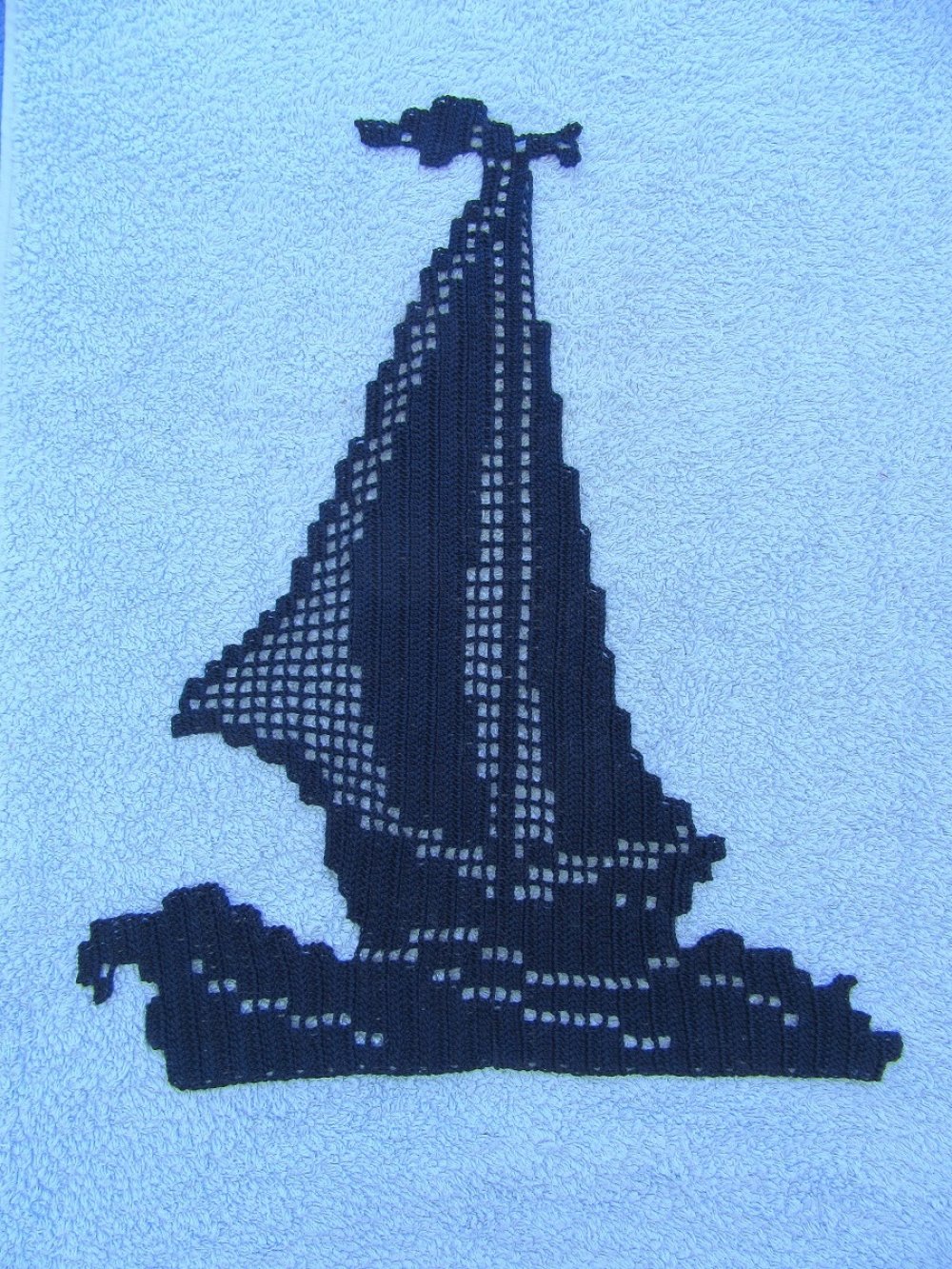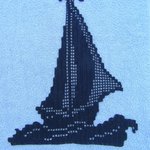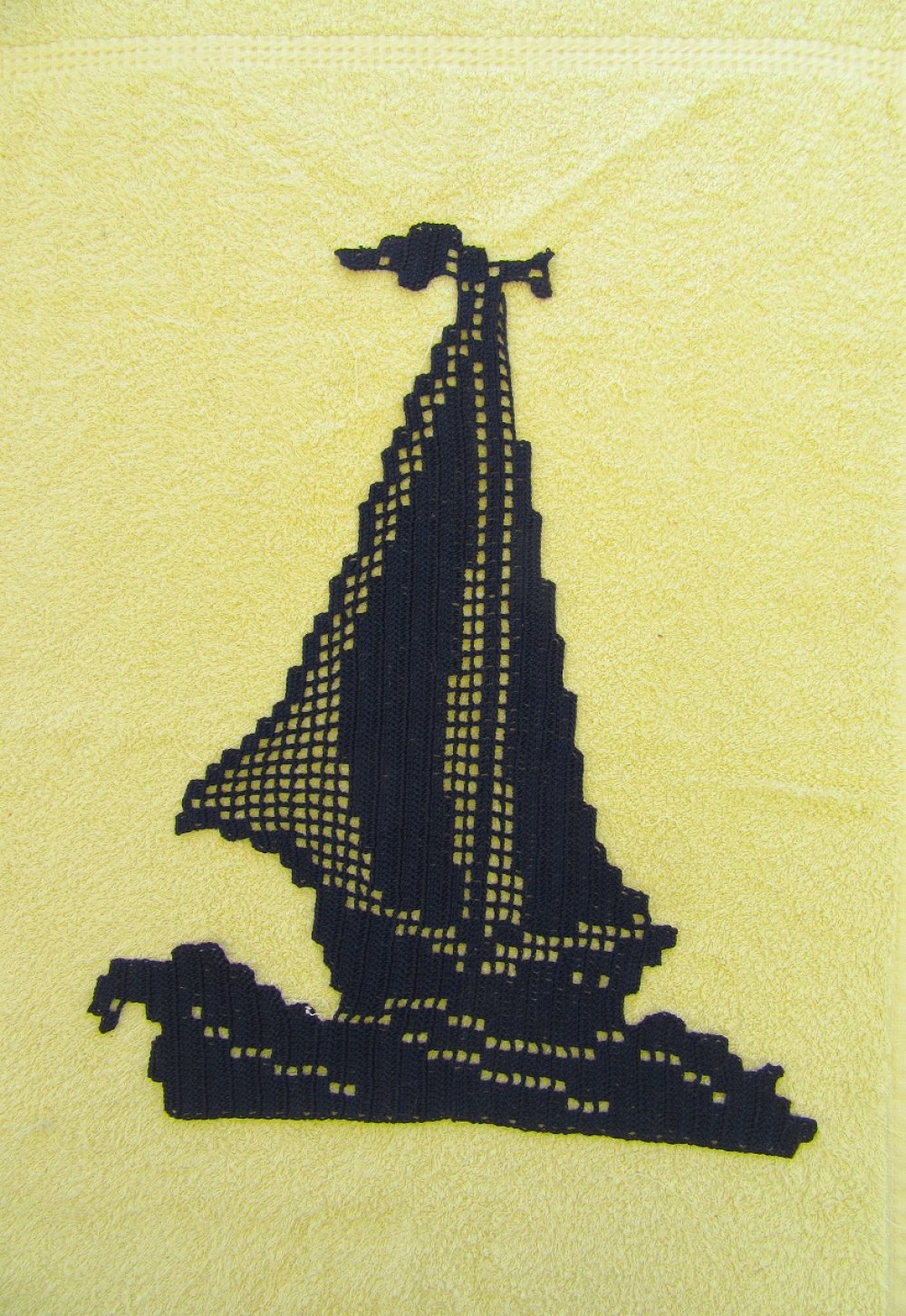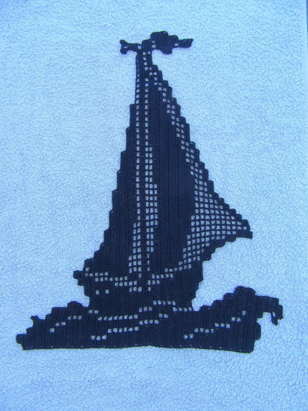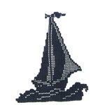 Napperon style marin : voilier au crochet en coton bleu. Textile décoratif.