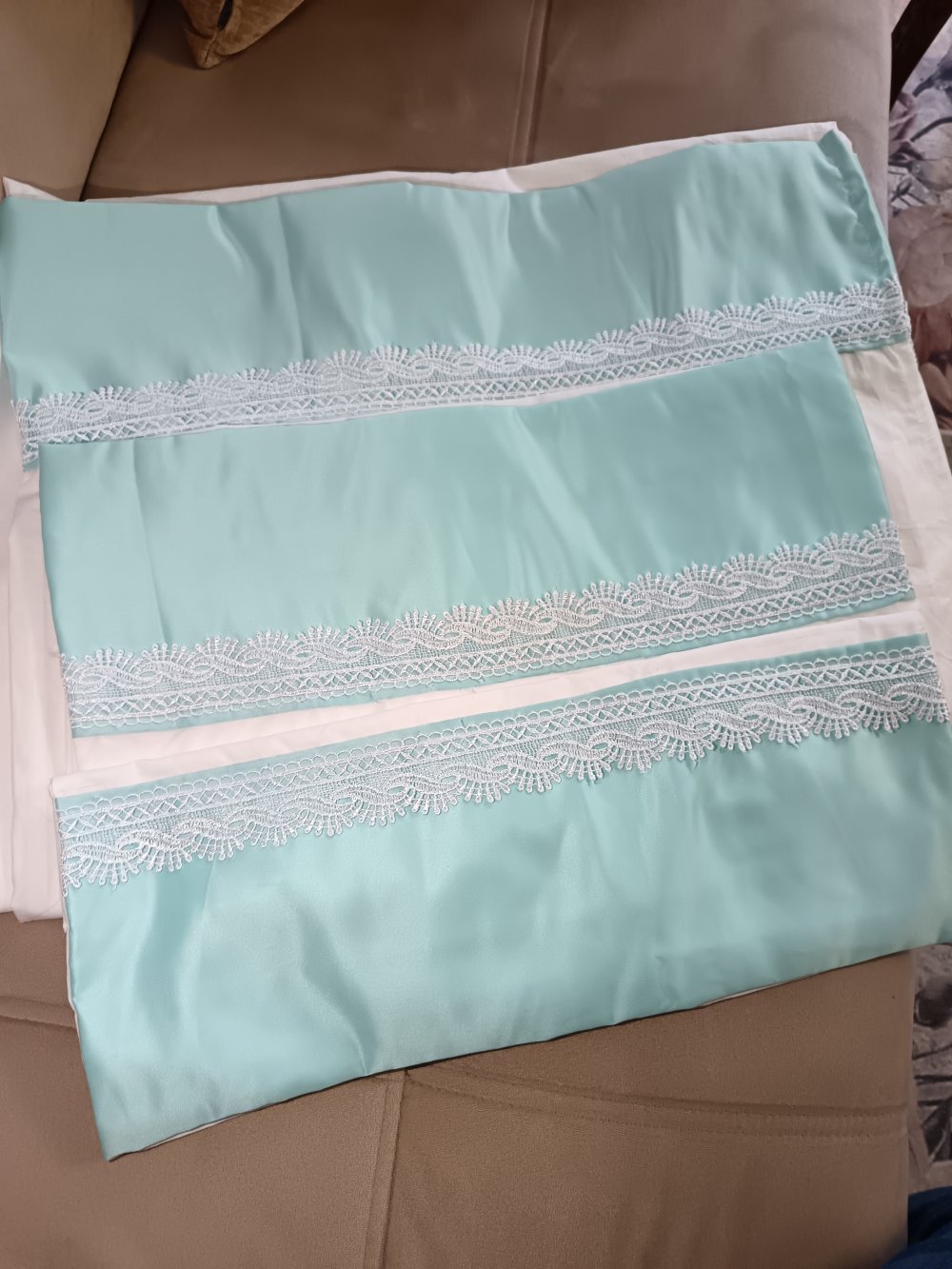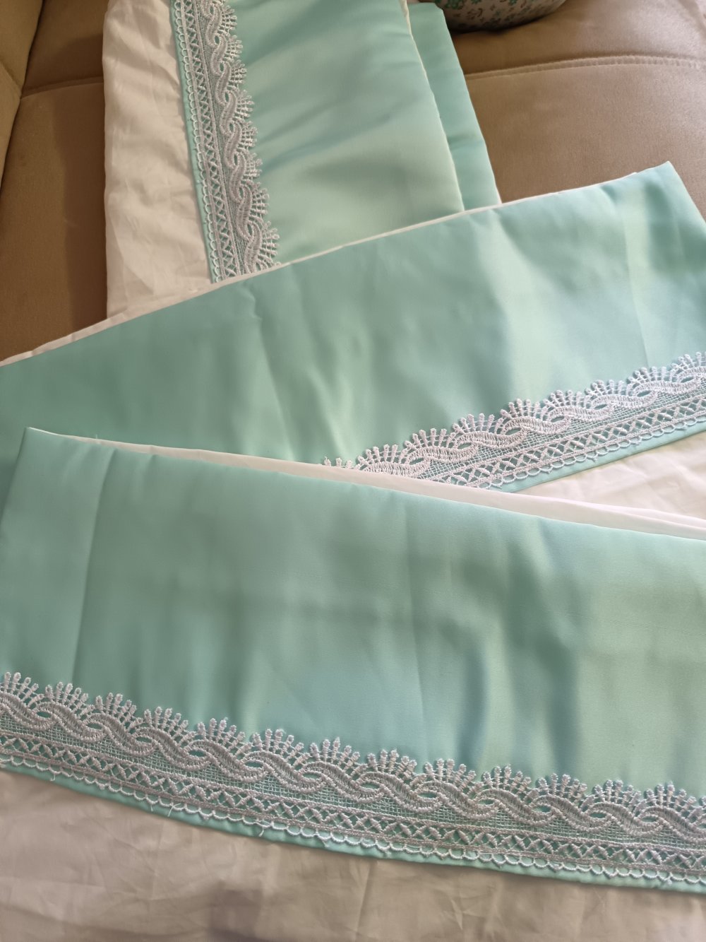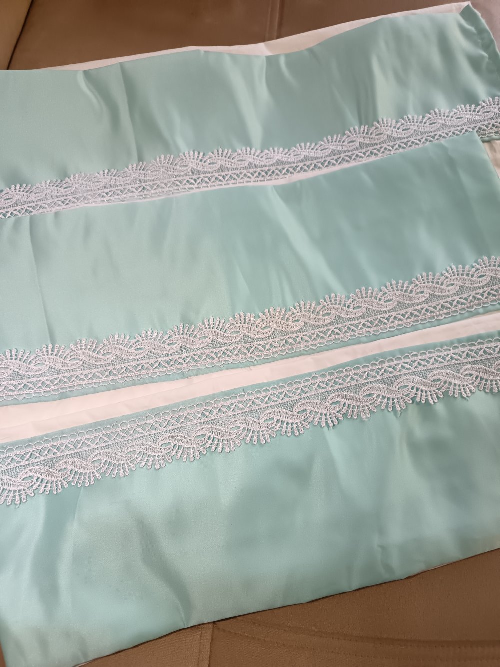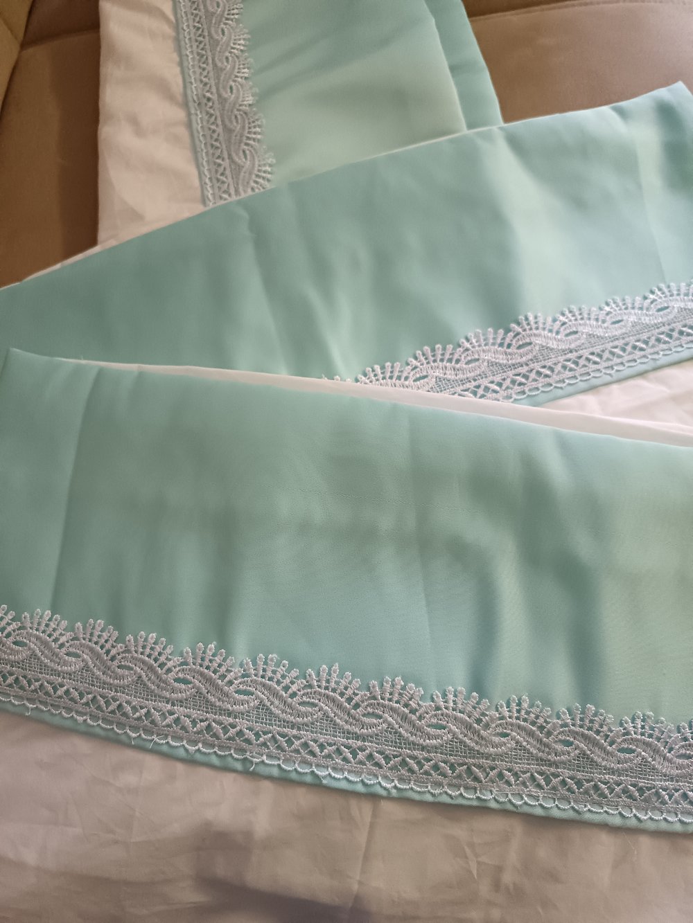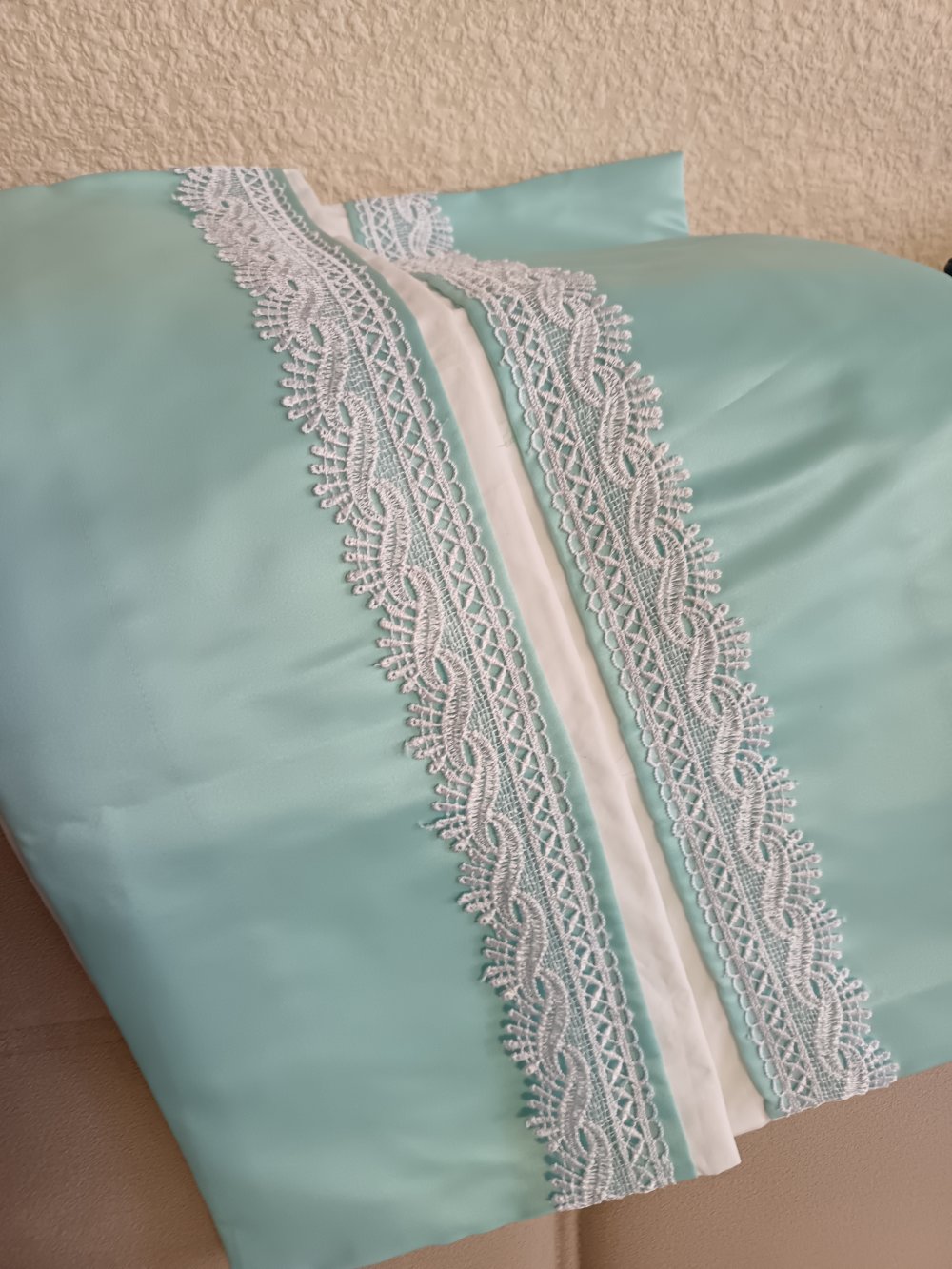 parure de lit simple, linge de lit fait main, drap plat coton neuf, parure 3 pièces, drap satin dentelle, taies d’oreiller assorties, linge de lit artisana, drap vert d’eau, linge de maison élégant, drap fait main neuf, idée cadeau maison,