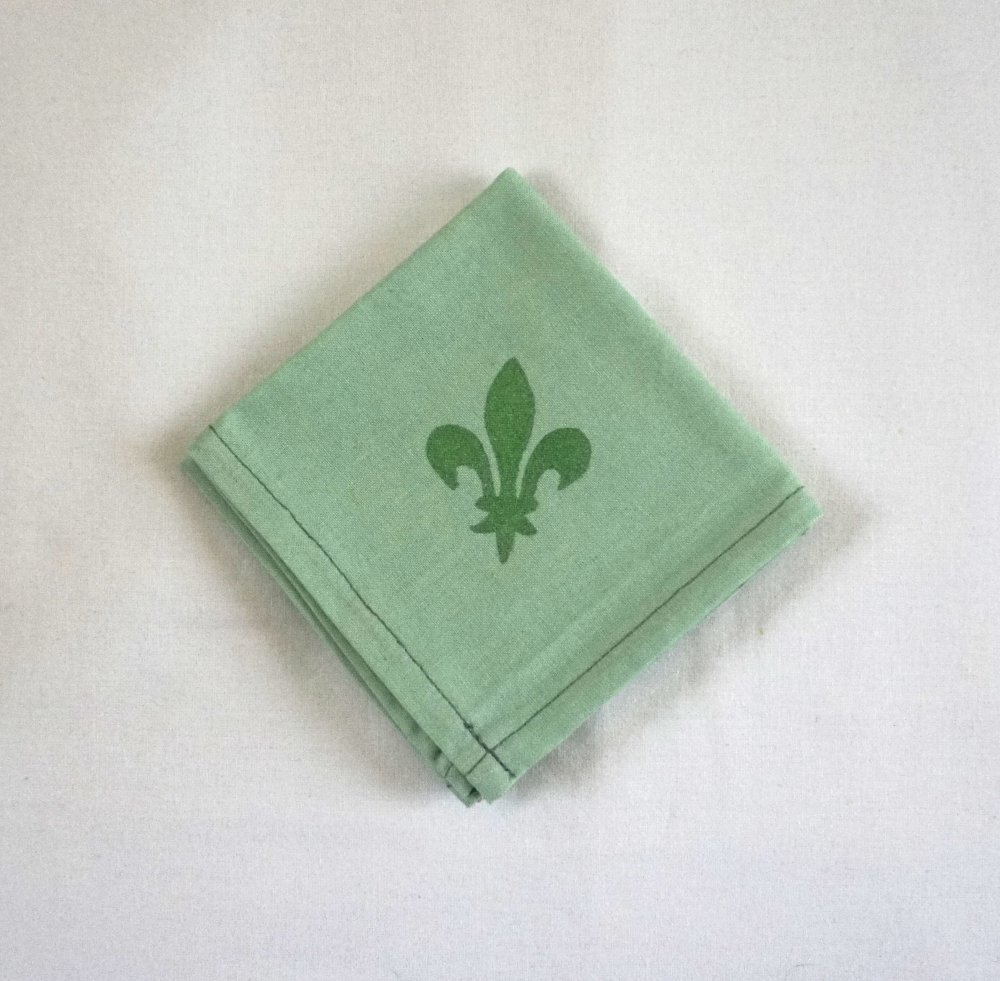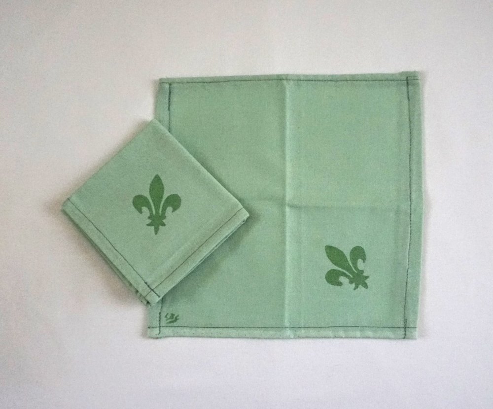 serviette de cocktail peinte à la main en coton vert d'eau avec une fleur de lys verte,. La peinture est fixée au fer chaud et ne bouge pas.