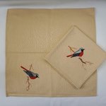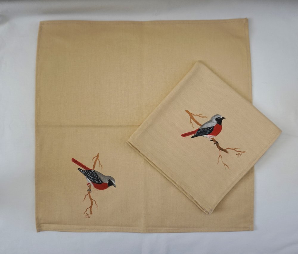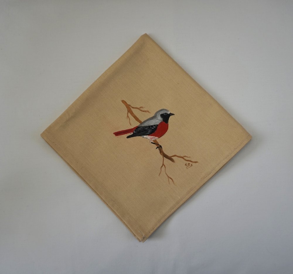 serviette de table en coton beige avec comme motif un rouge-queue sur sa branche peinte à la main. La peinture est fixée au fer chaud et ne bouge pas.